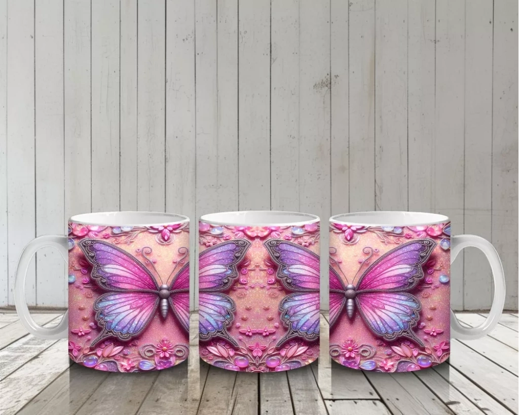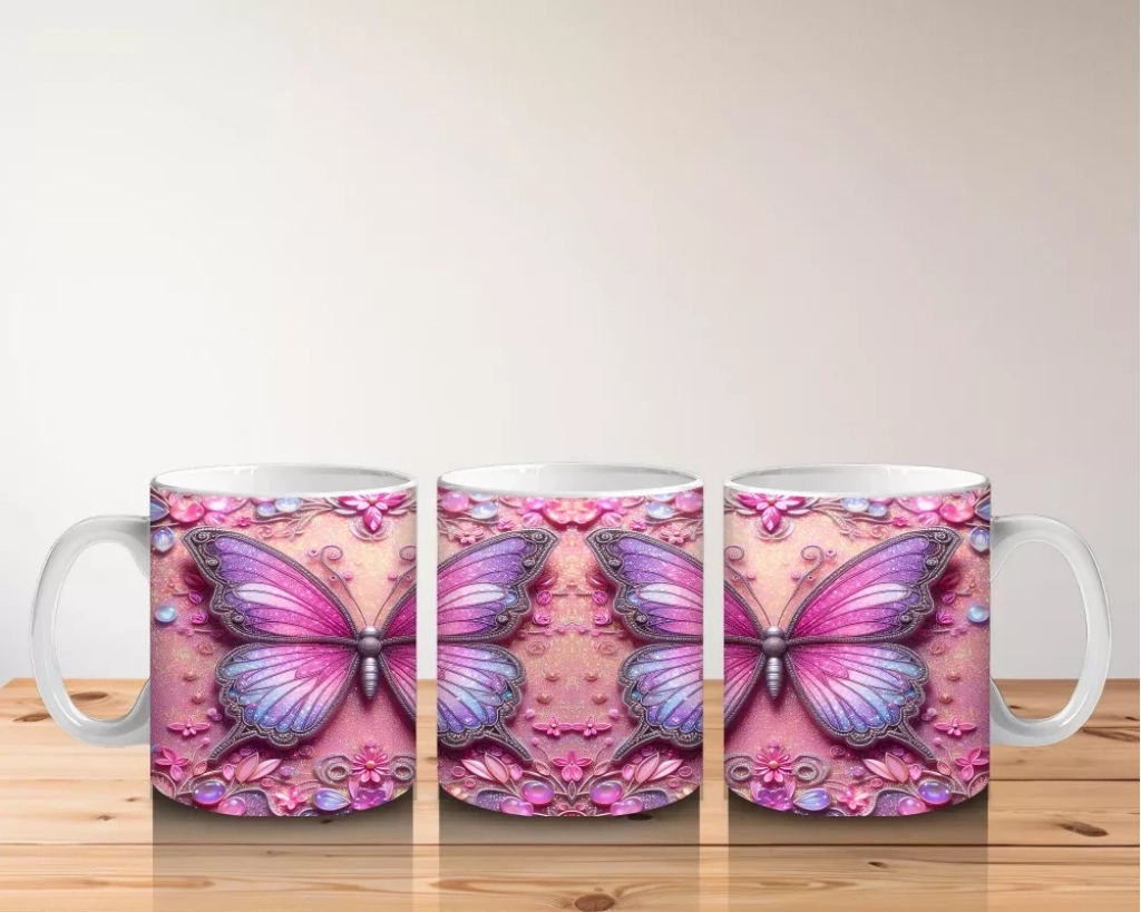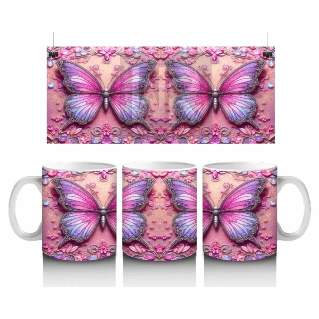 Pembe Arka Planlı Çift Mor Kelebek Deseni – Baskılı Kahve Kupası