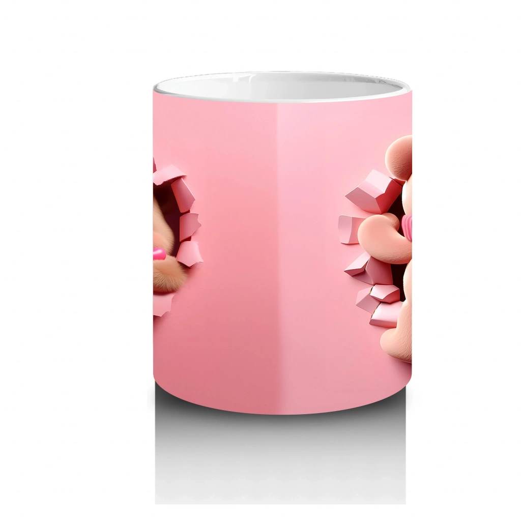Pembe beresiyle hem yandan hem arkadan görünümüyle sunulan bu sevimli ayıcık, tasarıma çift yönlü tatlılık katıyor. Detayları sevenler için hem eğlenceli hem özgün bir kupa tercihi.