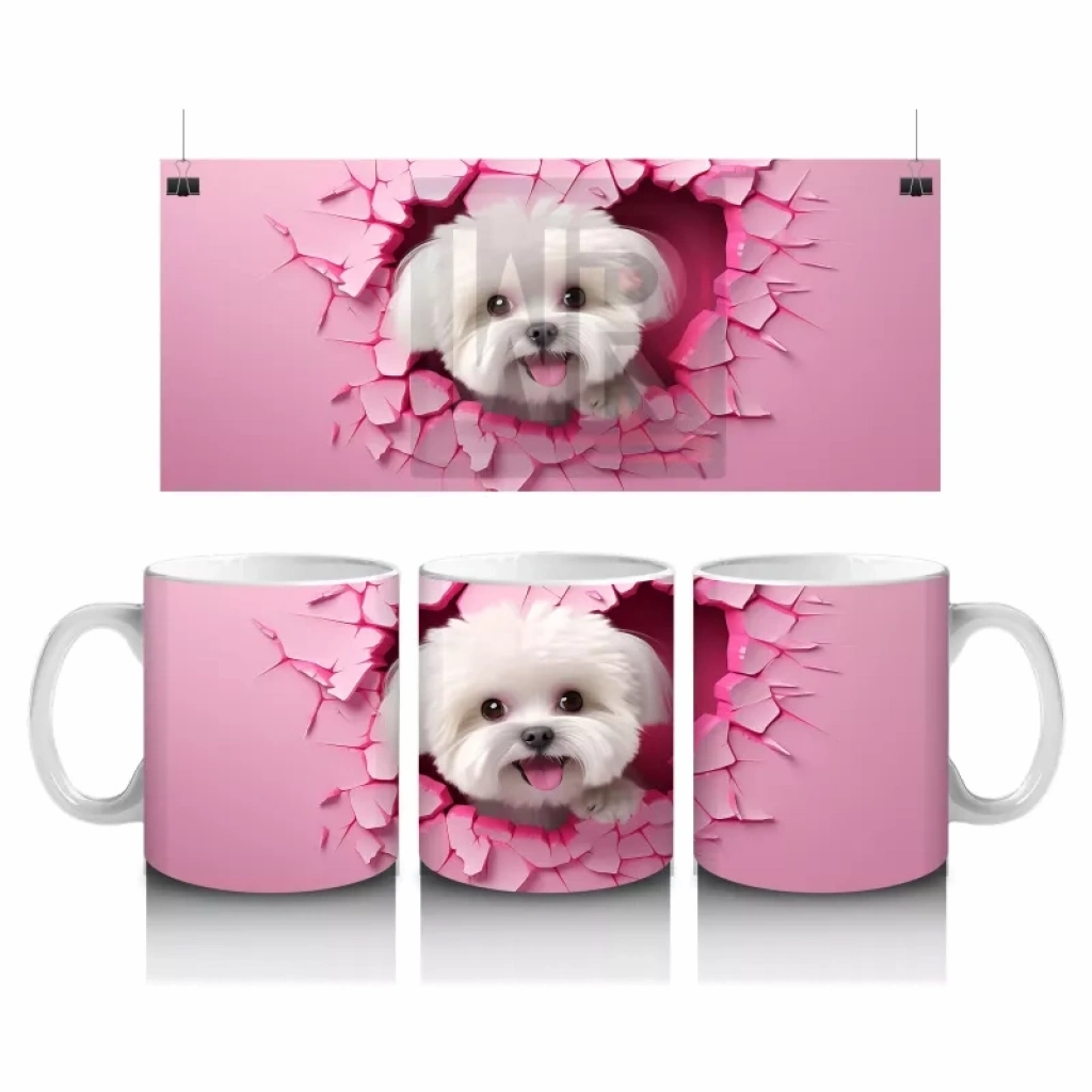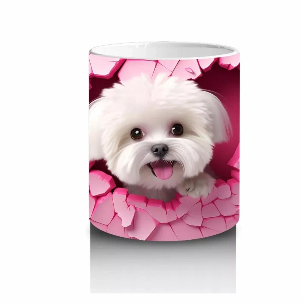 Pembe çatlak duvar arasında gülümseyen beyaz terrier, sıcak ve sevimli bir atmosfer yaratıyor. Neşeli ve içten detayları sevenler için özel bir tasarım.