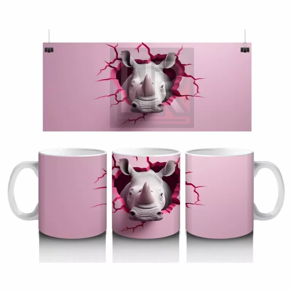 Pembe çatlak duvarın arasından bakarak dikkat çeken bu sevimli gergedan, hem güçlü hem de yumuşak bir karakter yansıtıyor. Hayvan temalı koleksiyonlara farklı bir dokunuş katıyor.