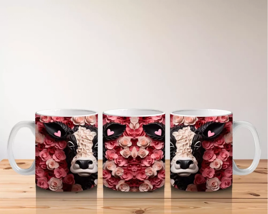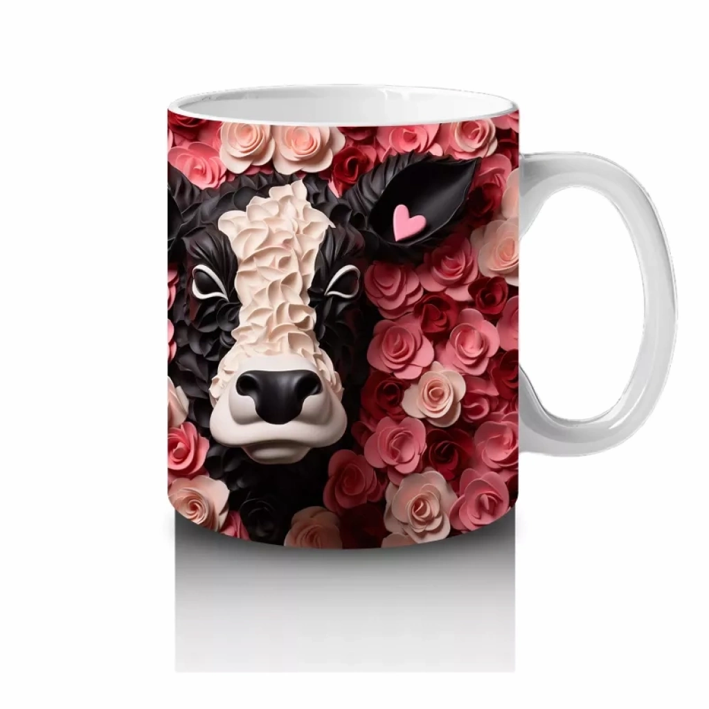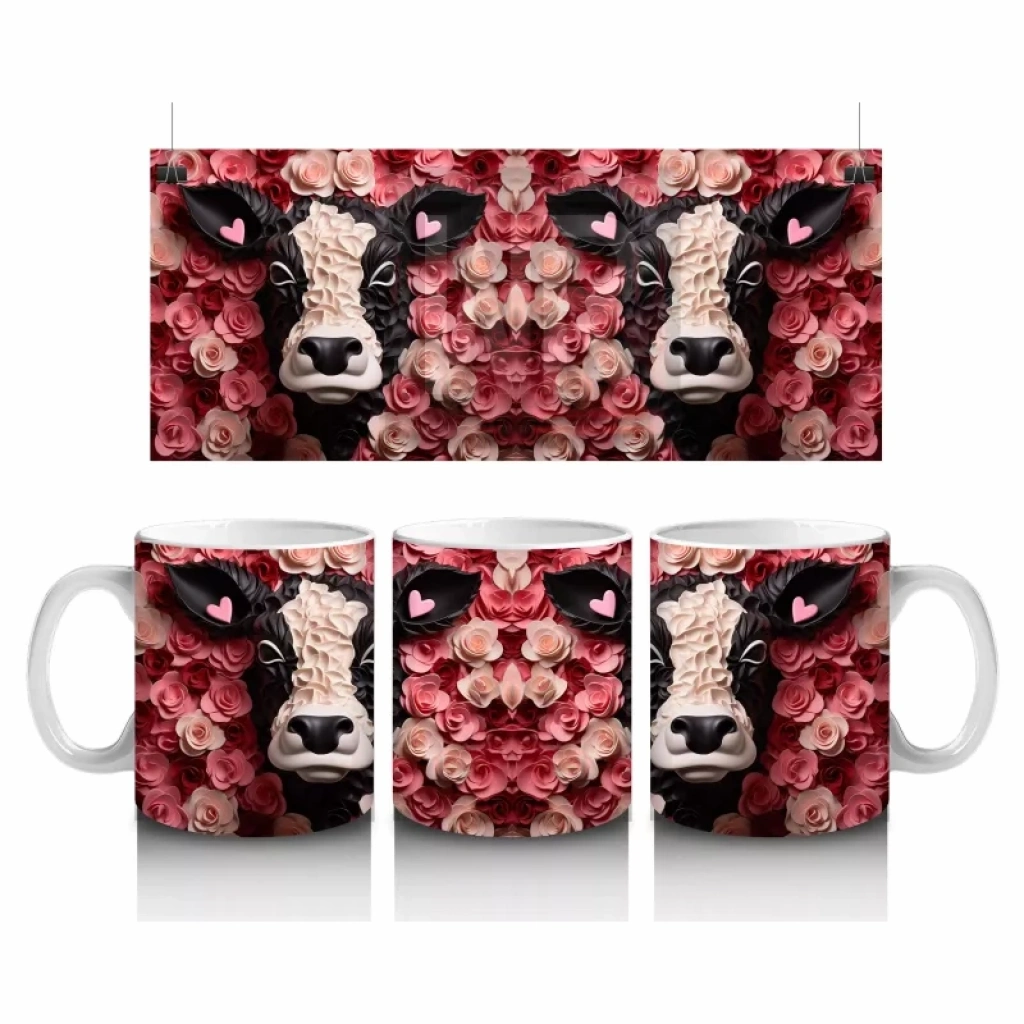 Siyah beyaz inek figürü, pembe çiçeklerle bezeli huzurlu bir bahçede dinginlik sunuyor. Kırsal yaşamın sevimli yüzünü yansıtan bu tasarım, doğal temalara ilgi duyanlar için birebir.