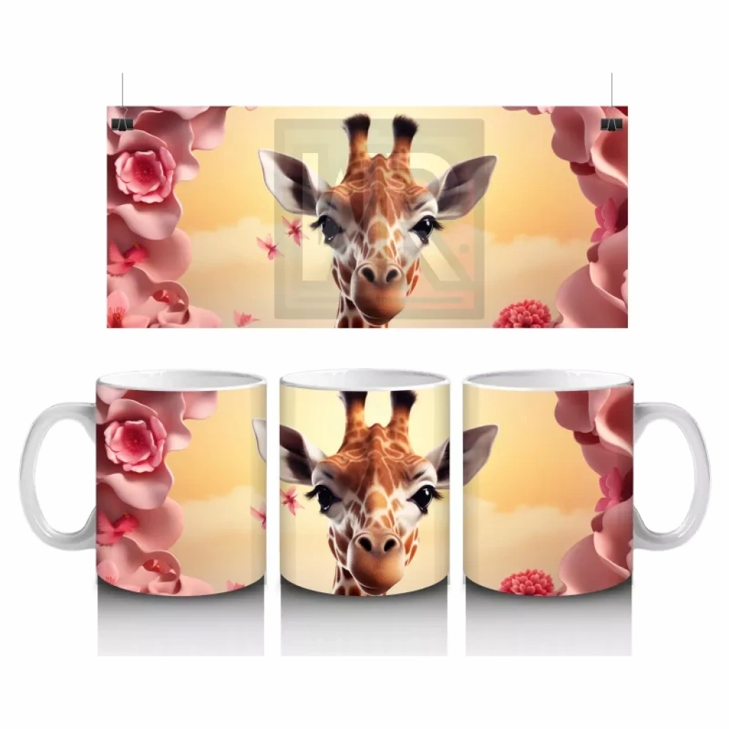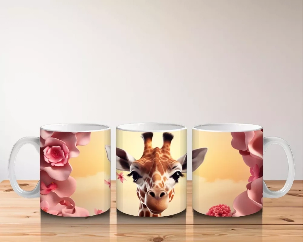 Sevgi dolu bir bahar havası! ? Sevimli zürafa, pembe çiçeklerle bezeli fonda adeta kalpleri eritiyor. Her yudumda doğanın huzuru bu kupada.