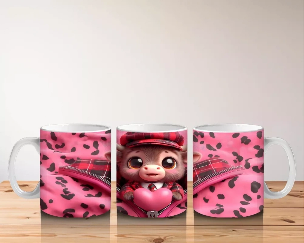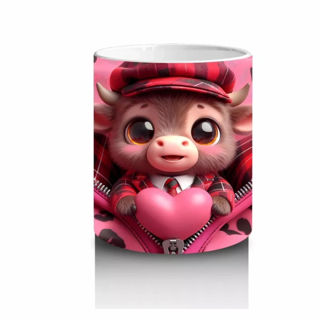 Şapkalı Sevimli Buzağı ve Pembe Kalpler – Baskılı Kupa Bardak