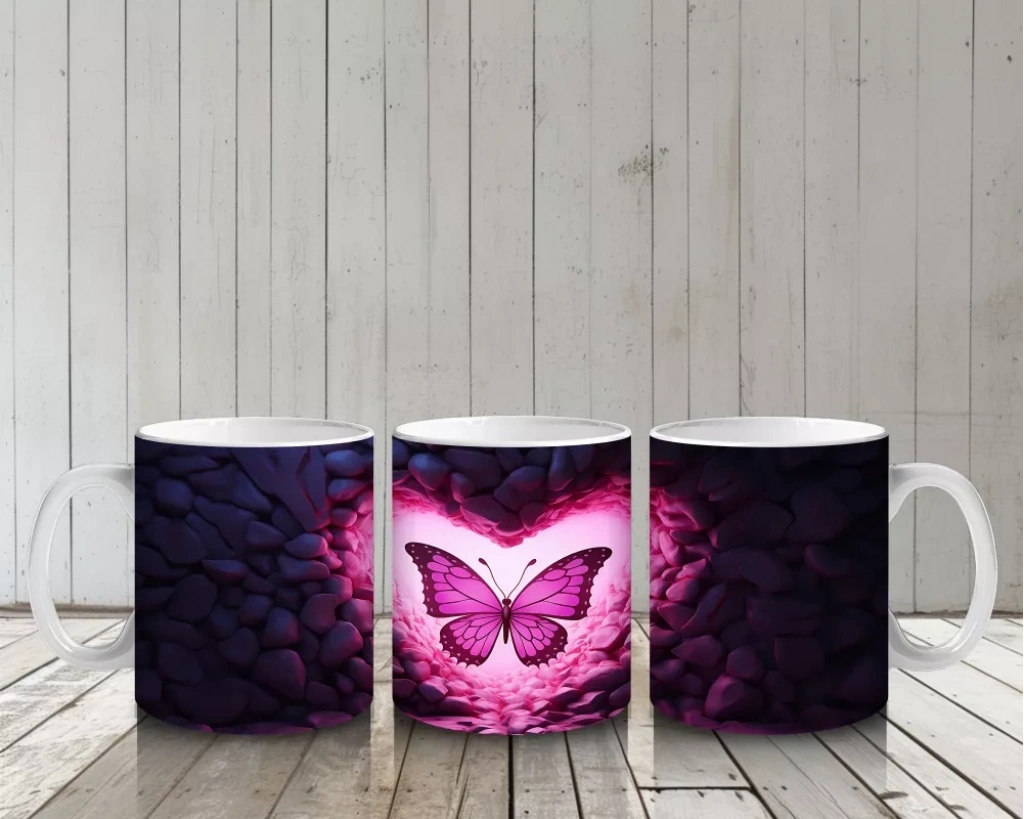 Pembe Işıklar Arasında Parlayan Kelebek – Baskılı Kahve Kupası