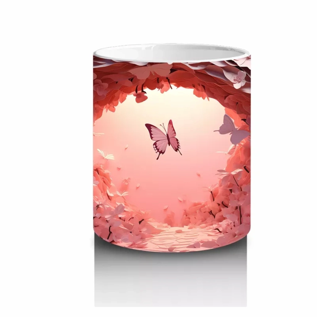 Pembe ışıkların büyüleyici atmosferinde uçuşan kelebekler, romantik ve büyülü bir hava yaratıyor. Duygusal ve etkileyici tasarımlar sevenler için özel bir kupa.