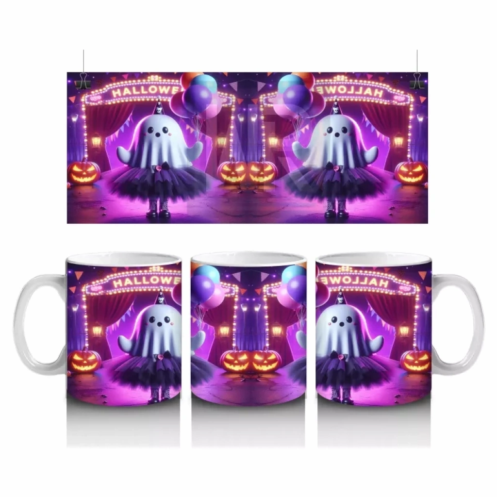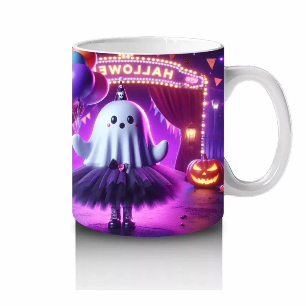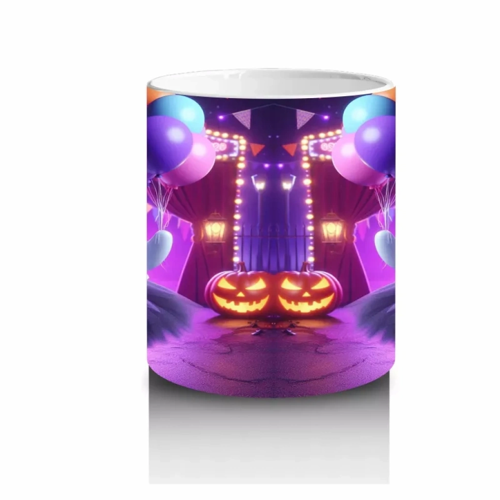 Pembe ışıklı sahne üzerinde dans eden cadı figürüyle hazırlanan bu renkli kupa bardak, Cadılar Bayramı’na enerjik ve büyülü bir dokunuş yapar.