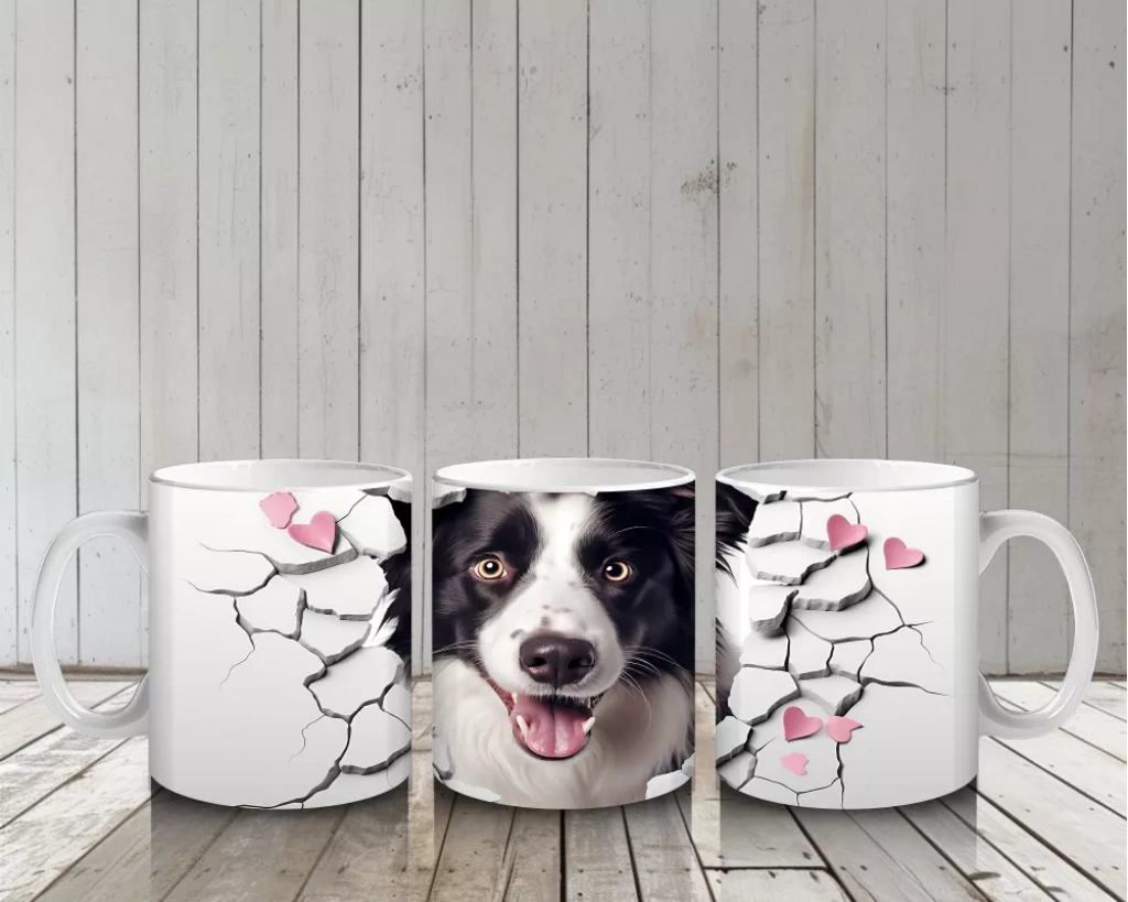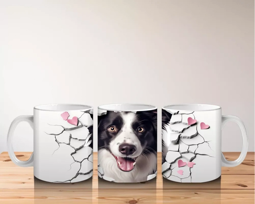 Pembe kalplerin arasından çatlağı delip bakan Border Collie, enerjik ve sevimli bir duruş sergiliyor. Dinamik ve romantik detayları sevenler için dikkat çekici bir kupa tasarımı.