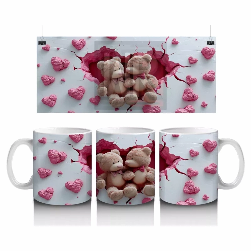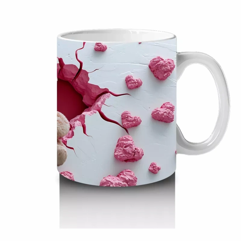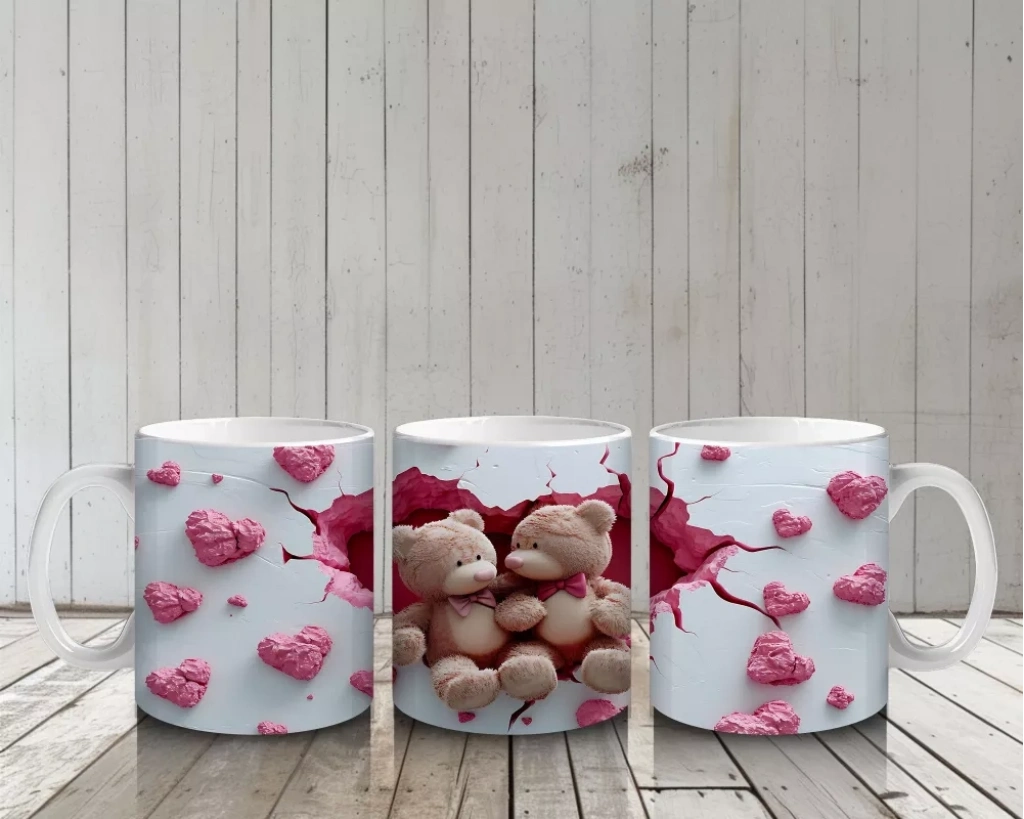 Pembe Kalplerle Süslenmiş Peluş Ayılar – Baskılı Kahve Kupası