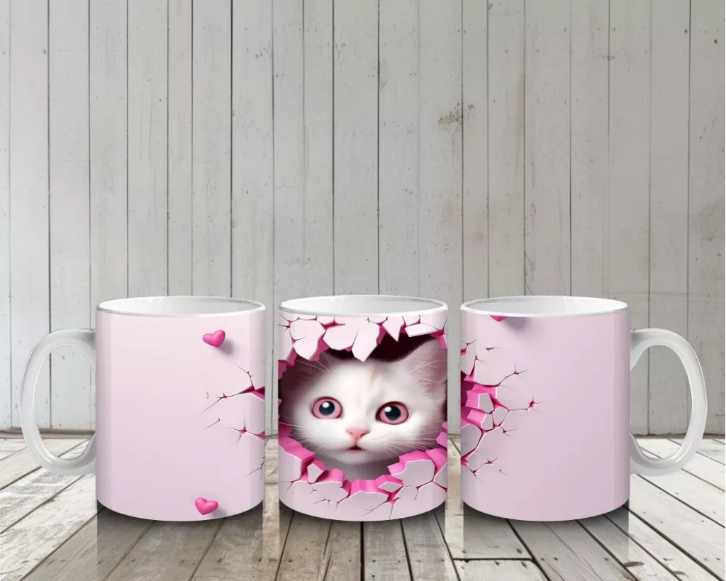 Pembe kalp detaylarıyla bezenmiş çatlak duvarın arasından bakan bu tatlı kedi, hem gizemli hem sevimli bir hava taşıyor. Yumuşak renkler ve iç ısıtan bir figürle harmanlanmış hoş bir kupa seçeneği.