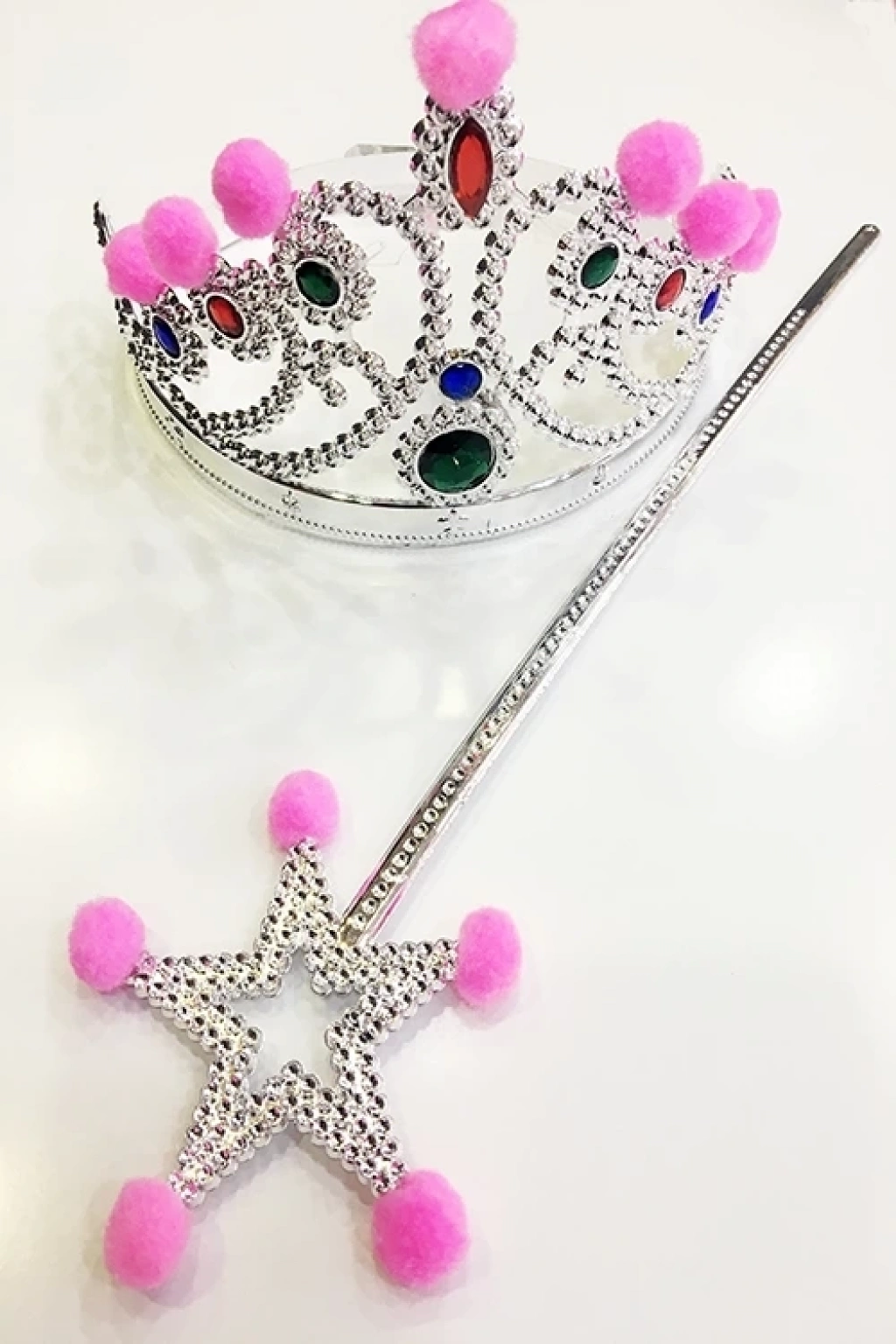 • Pembe Ponponlu Gümüş Renk Prenses Tacı Ve Gümüş Renk Prenses Asası
