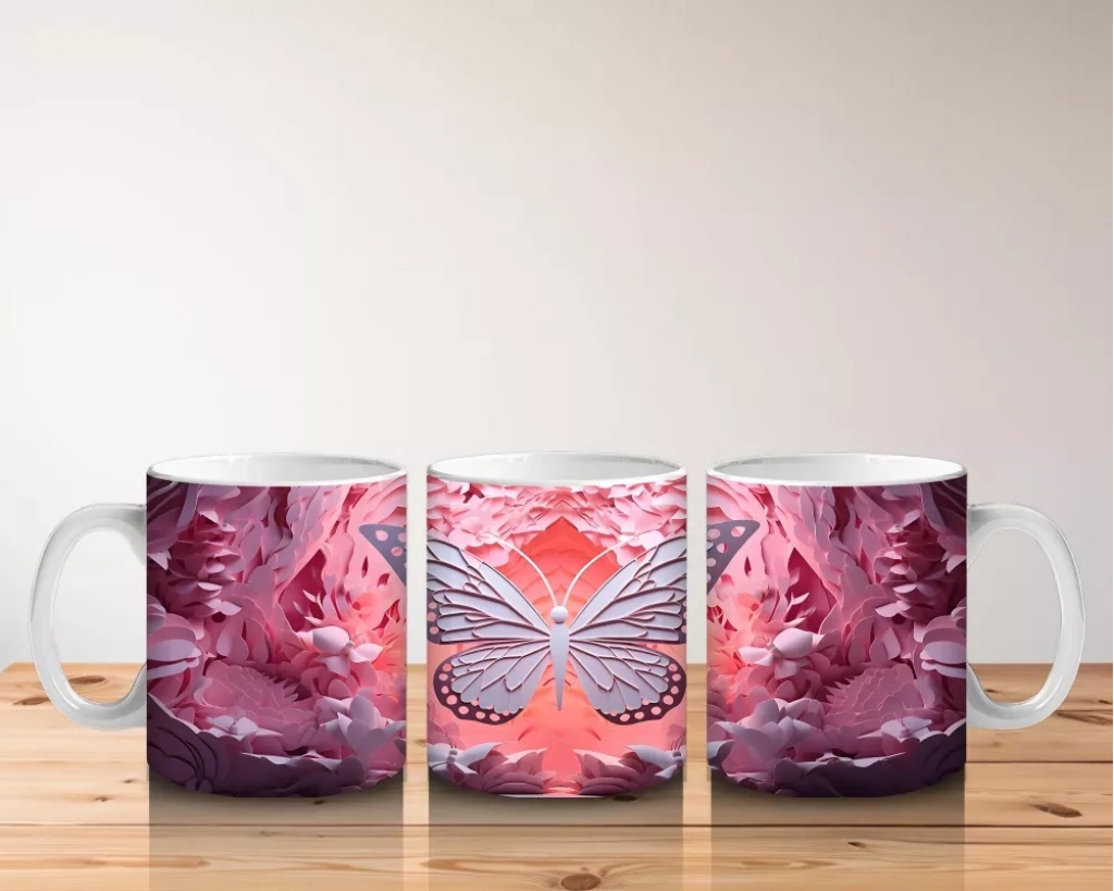 Pembe Rölyef Dokulu Parlayan Kelebek – Baskılı Kahve Kupası