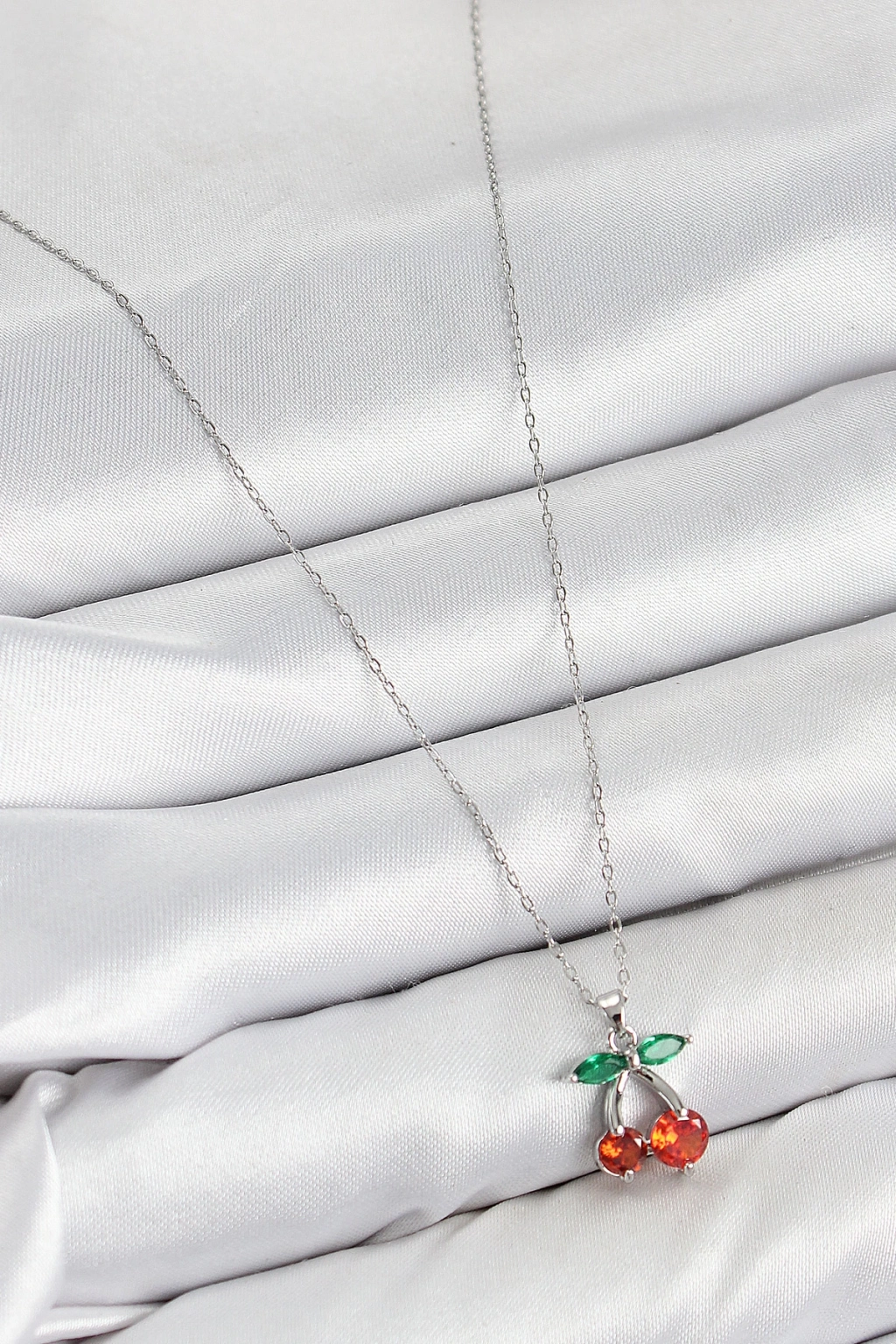 Pirinç Zirkon Taşlı Kiraz Model Gümüş Renk Kadın Kolye