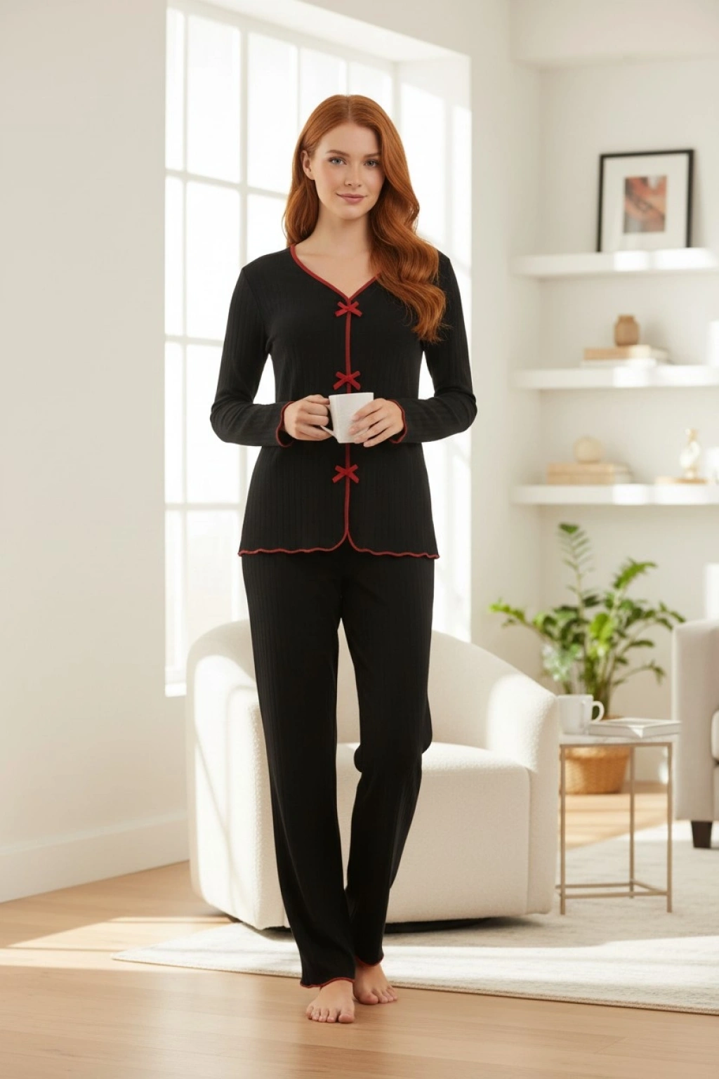 Premium Kadın 4’lü Fitilli Set – Siyah Kırmızı Biyeli (Pijama Üst, Pantolon, Bikini Takımı)
