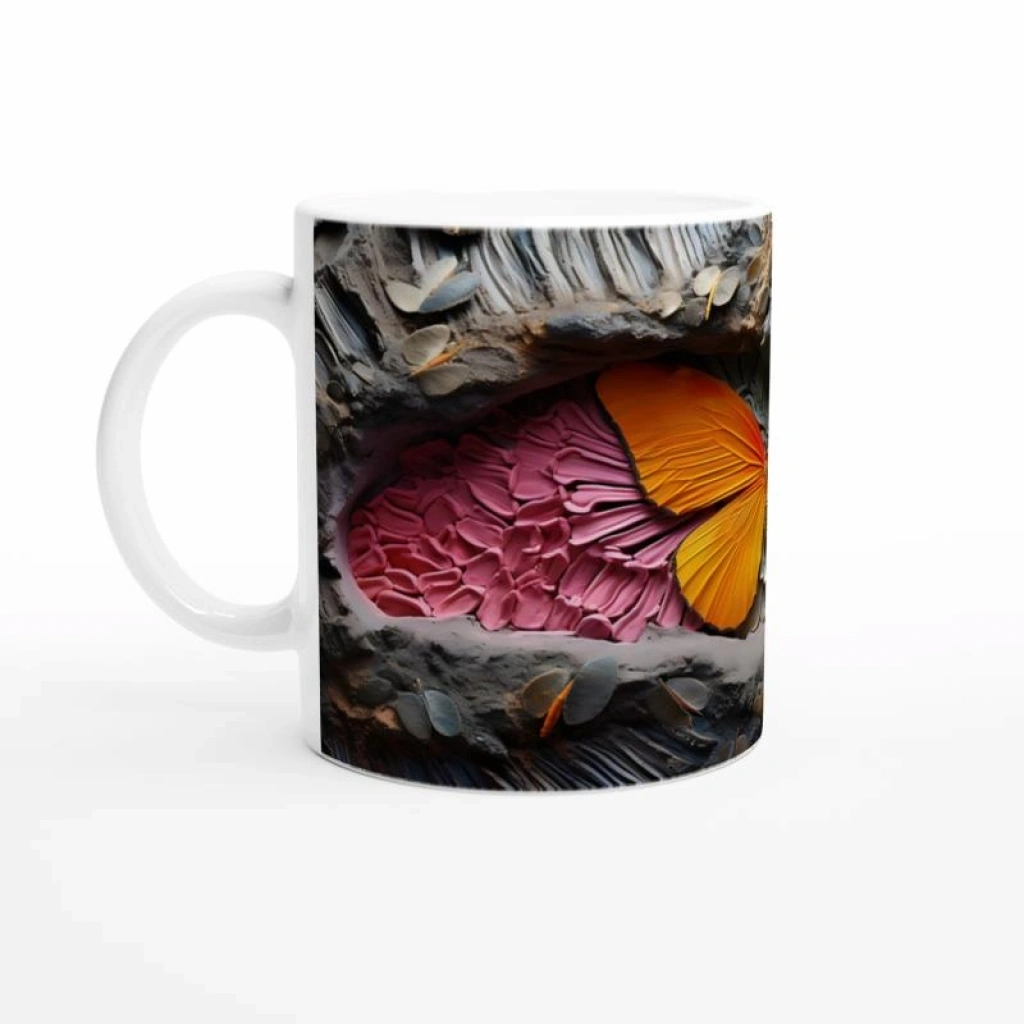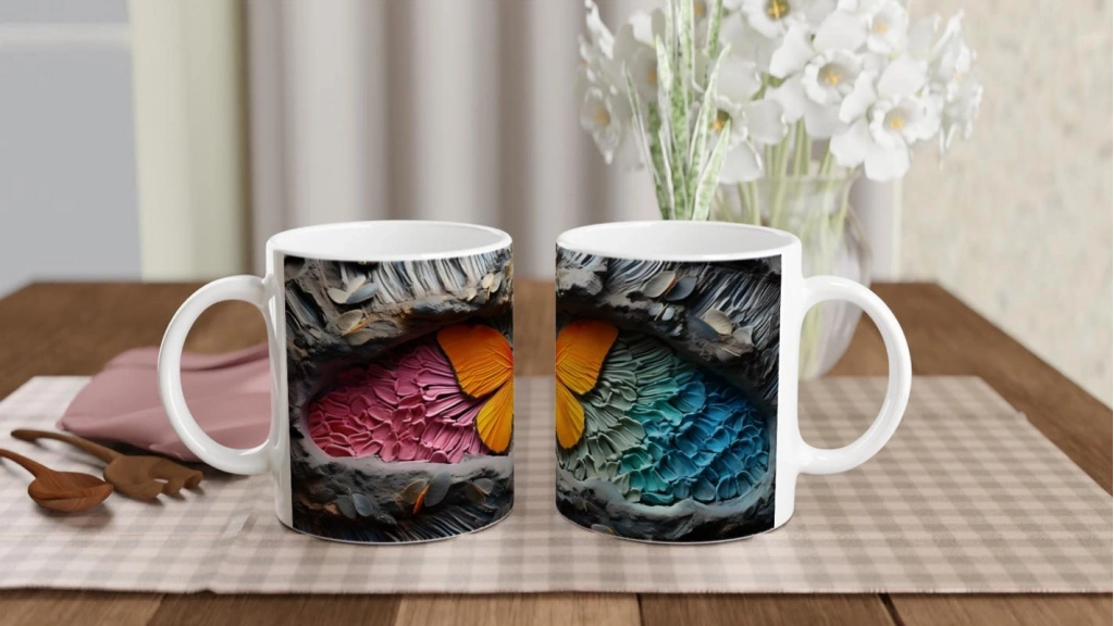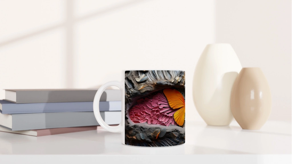 Renklerin Dansı İçinden Fırlayan Kelebek Temalı Baskılı Kupa Bardak, pembe, turuncu ve mavi tonlardaki çiçek benzeri dokular arasından çıkan turuncu kelebek figürüyle dikkat çeker. Sanatsal dokunuşlarla bezenmiş bu özel kupa, her yudumda ilham verir.