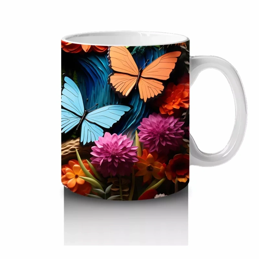 Cam mozaik etkisiyle parlayan mavi ve turuncu kelebekler, sanatsal bir doku ve göz alıcı renk geçişleri sunuyor. Detaylı ve estetik tasarımlardan hoşlananlara özel benzersiz bir kupa modeli.