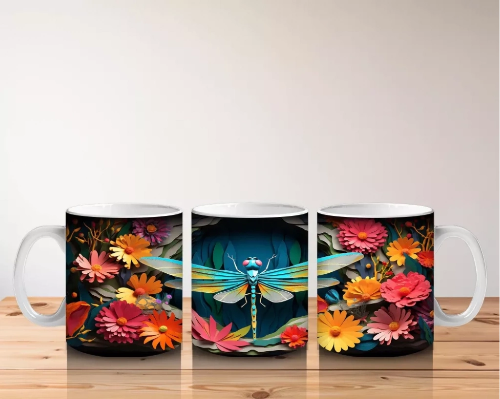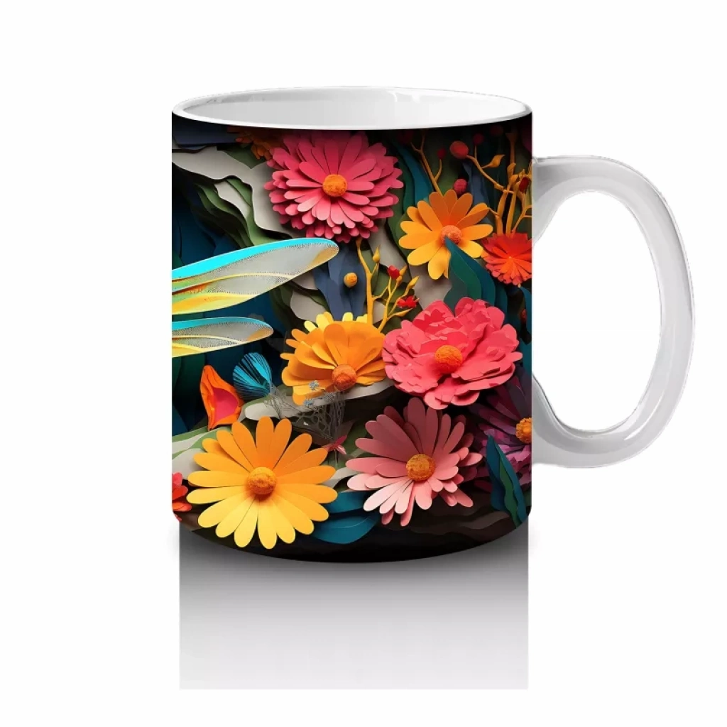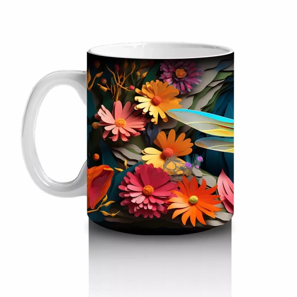 Renkli Çiçekler Arasında Yeşil Yusufçuk – Baskılı Kupa