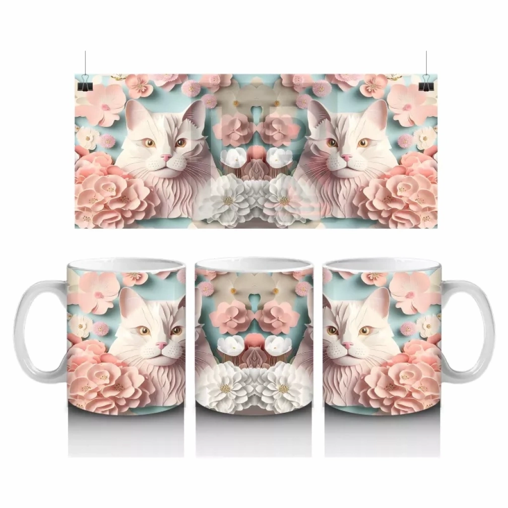 Renkli Çiçeklerle Süslenmiş Kedi Ailesi – Baskılı Kahve Kupası