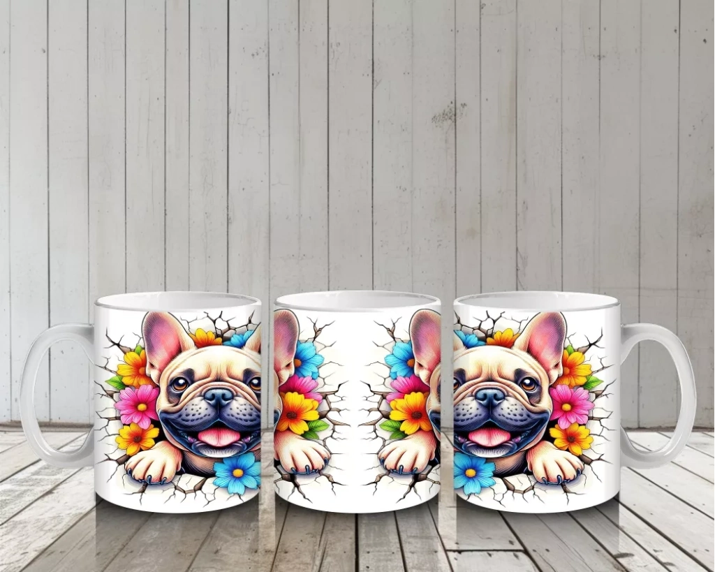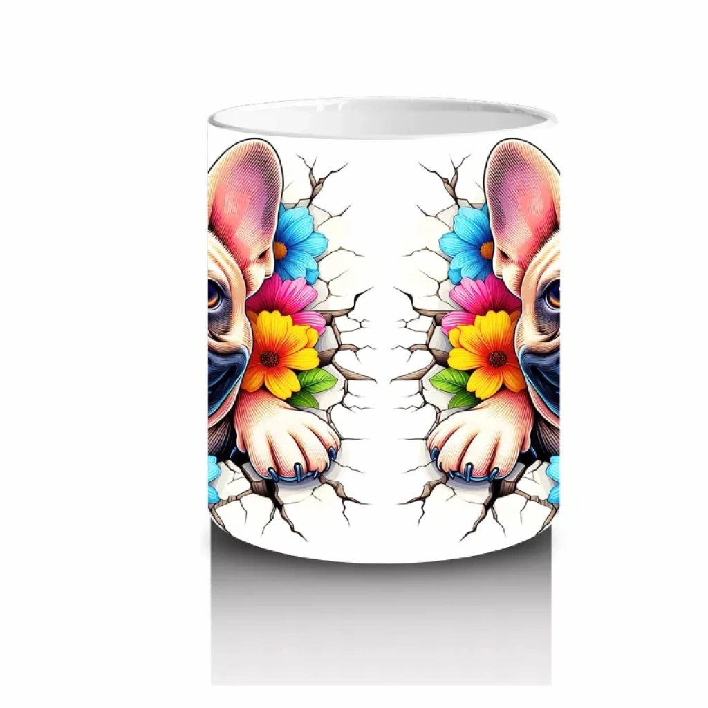 Renkli çiçeklerle süslenmiş fonda duran Fransız Bulldog figürü, canlılık ve sevimliliği bir arada sunuyor. Modern ve enerjik tasarımlar sevenler için özel bir kupa.
