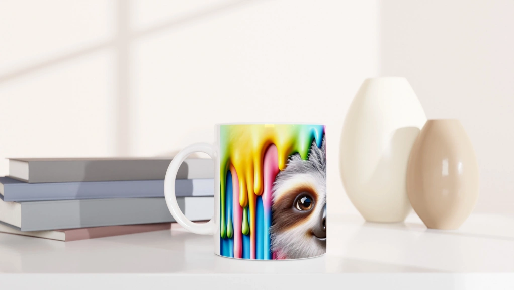 Renkli Damlalar Arasında Gülümseyen Tembel Hayvan Temalı Baskılı Kupa Bardak, yumuşak tüy dokusu ve sıcak bakışlarla birleşerek pozitif ruh halini destekleyen özel bir tasarım sunar. Sanatsal detaylar ve canlı renk paletiyle dikkat çeker.