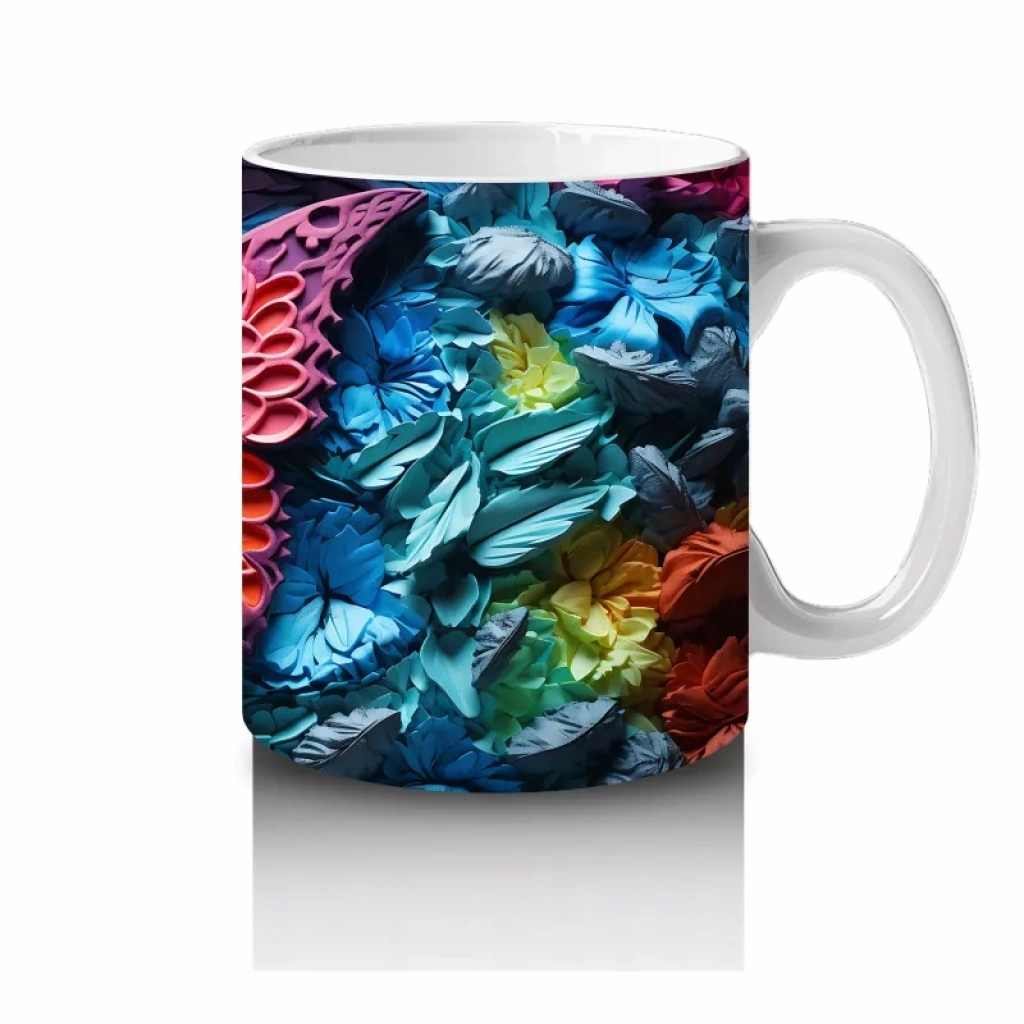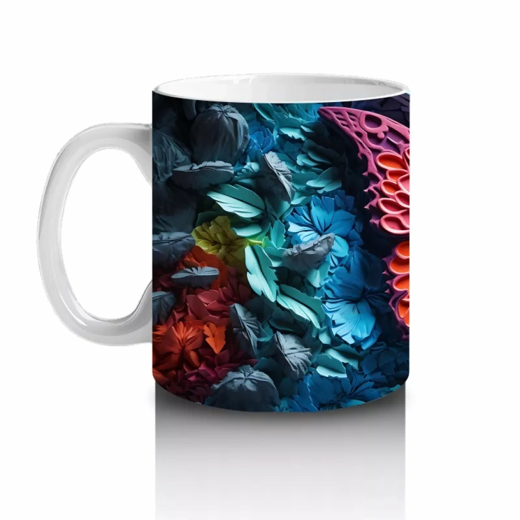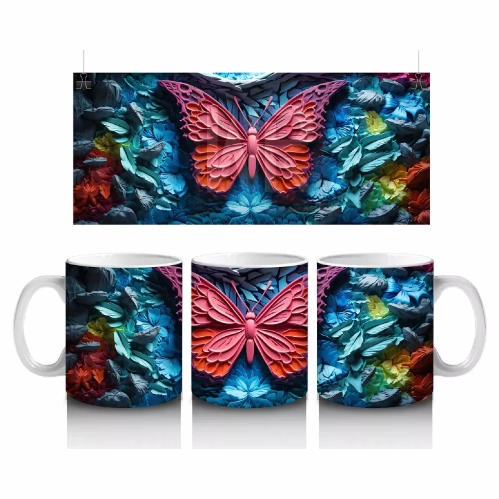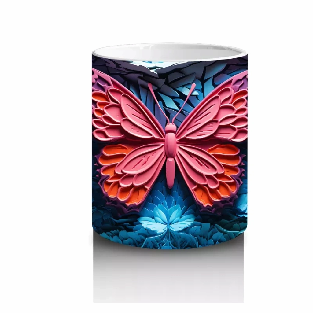 Canlı renklerle bezeli kabartmalı zeminde zarifçe konumlanan pembe kelebek, bu tasarıma sanatsal ve romantik bir hava katıyor. Göz alıcı dokusuyla dikkat çeken özel bir kupa.