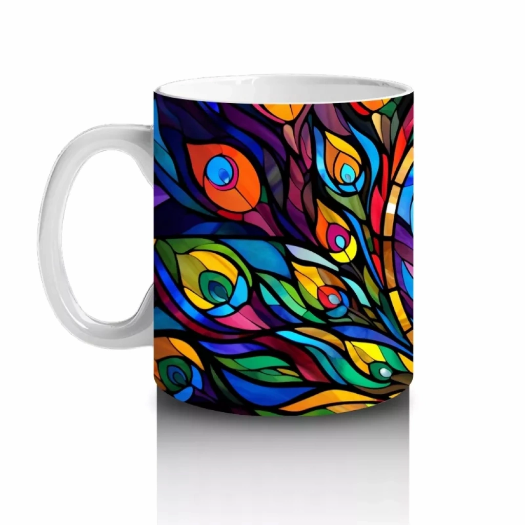 Renkli Tüy Desenleriyle Zarif Tavus Kuşu – Baskılı Kahve Kupası