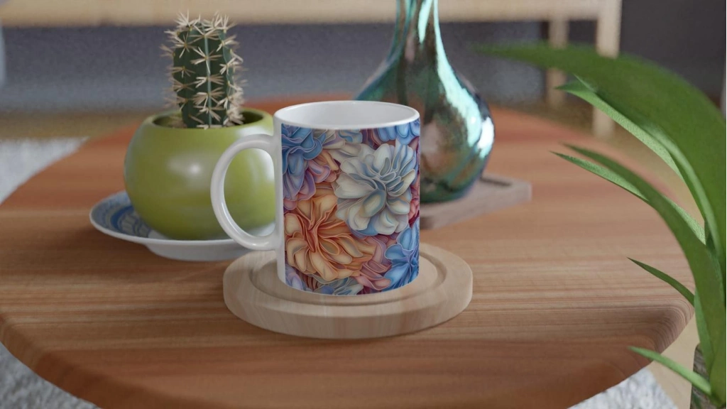 Gül tonlarından maviye uzanan zarif yaprak desenleriyle bu kupa bardak, romantik bir atmosfer yaratır.
