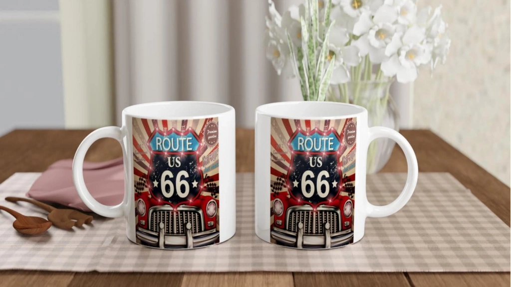 Işıltılı detaylar ve yarış bayraklarıyla süslenmiş bu Route 66 garaj kupası, hem dekoratif hem işlevsel bir hediye alternatifi sunar.