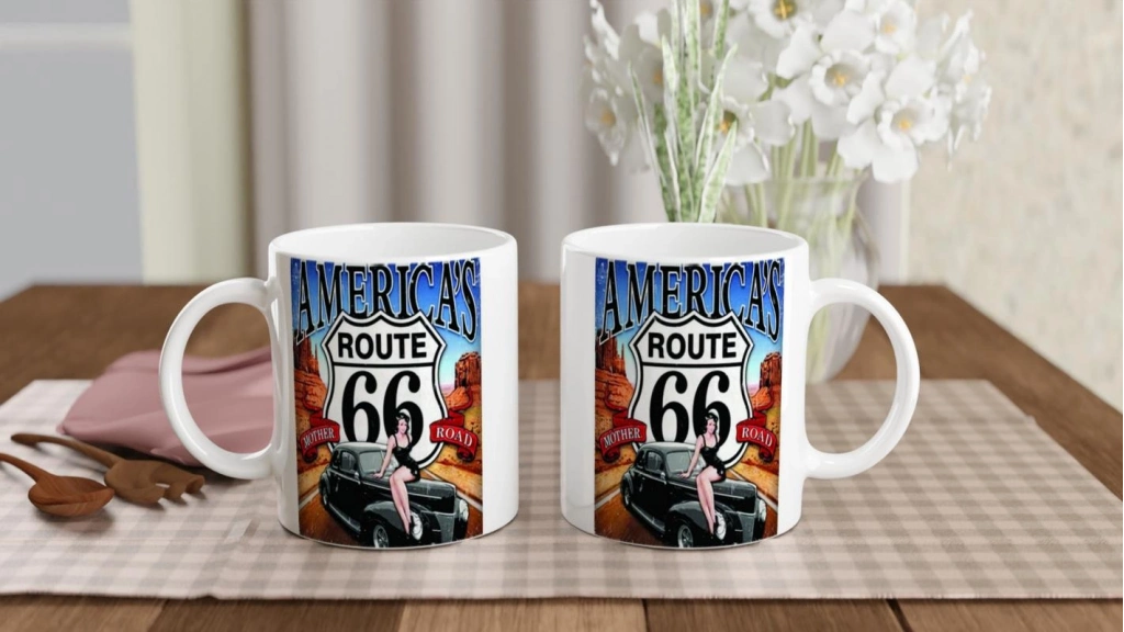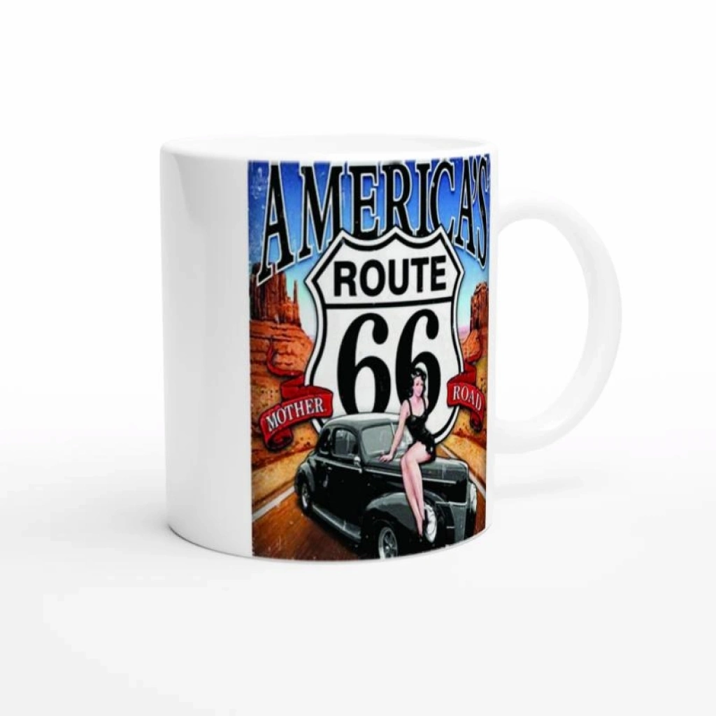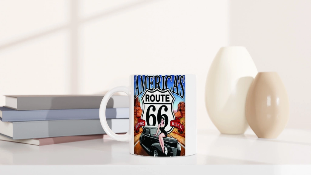 Efsanevi Route 66 tabelası, çöl manzarası ve siyah klasik araç üstündeki pin-up figürüyle koleksiyonluk bir parça.