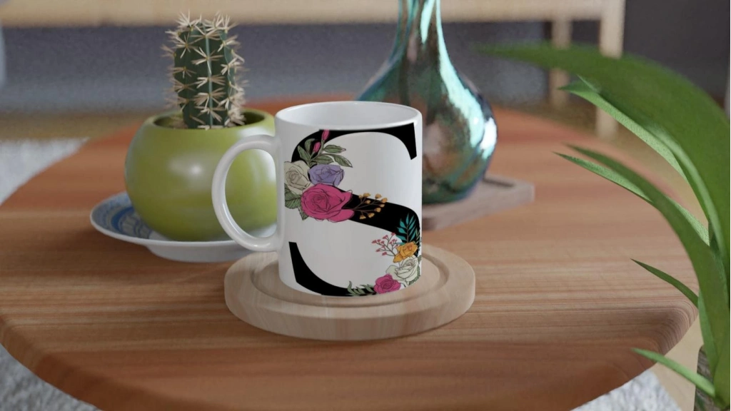 Canlı çiçek tonlarıyla zenginleştirilmiş bu s harfi baskılı kupa bardak, romantik ve sofistike tarzı sevenler için ideal.