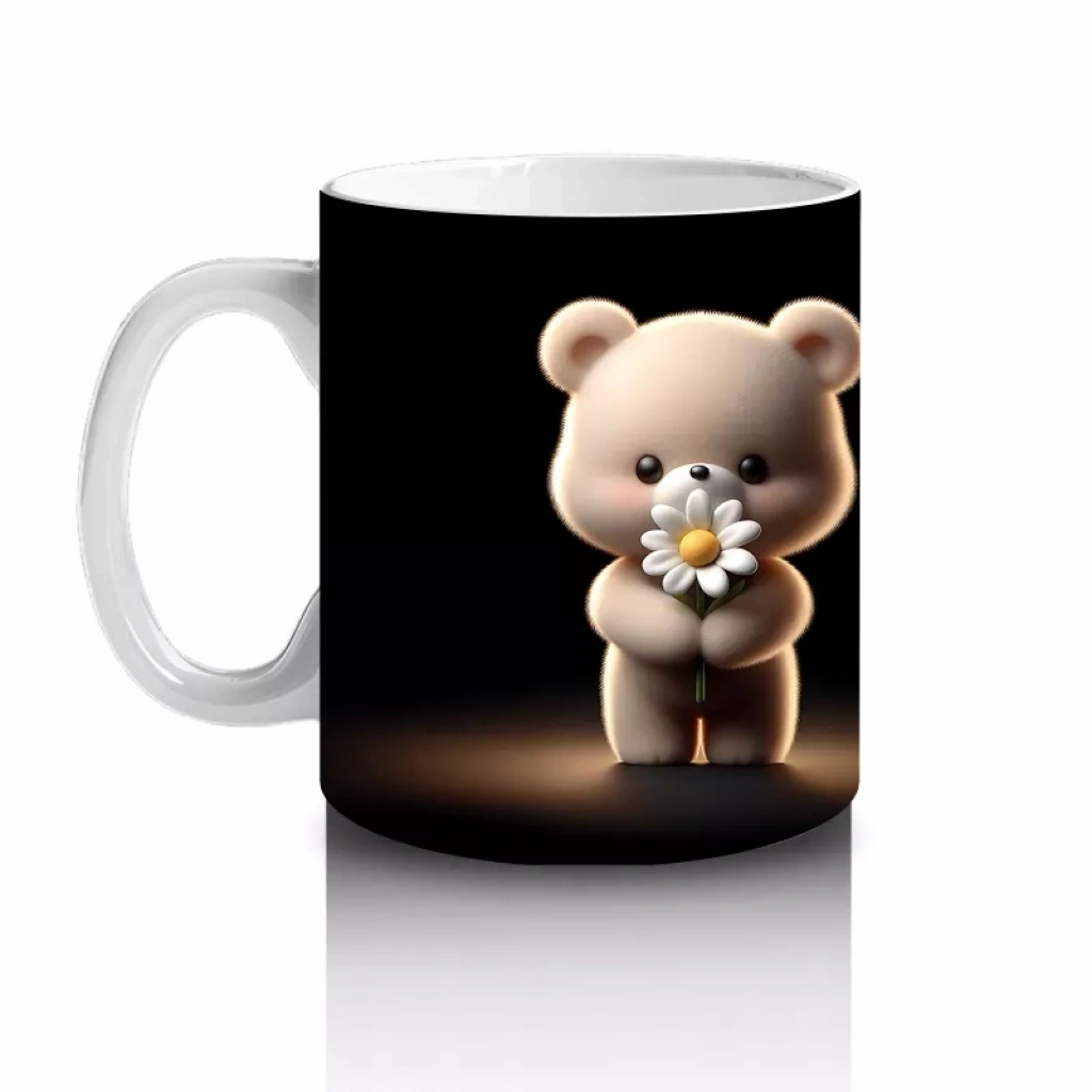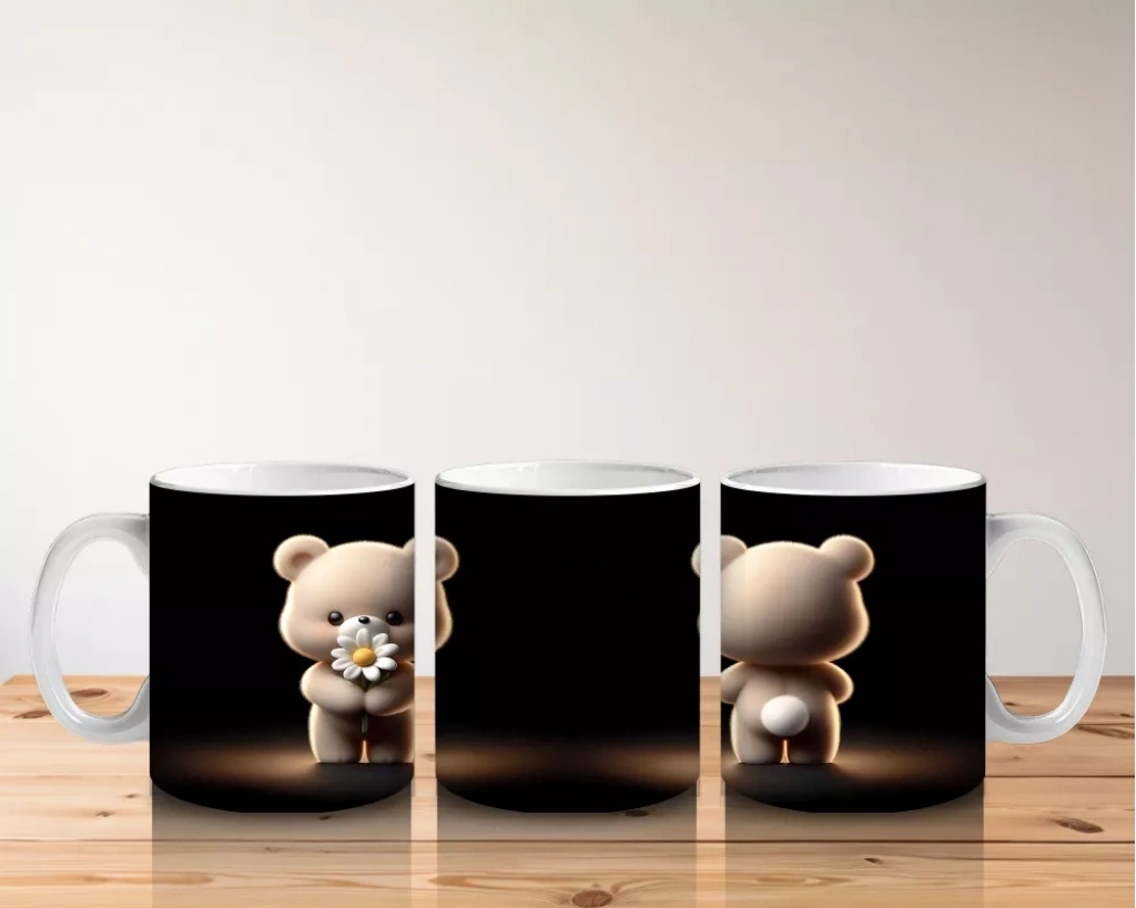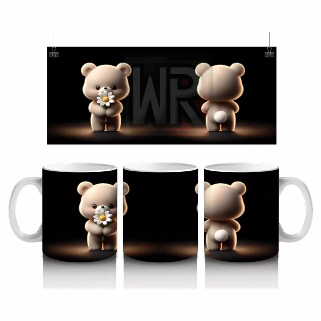 Sahne ışıkları altında arkası dönük şekilde duran peluş ayı, merak uyandıran ve duygulu bir kompozisyon sunuyor. Hikâyesi olan özel bir kupa tasarımı arayanlara hitap eder.