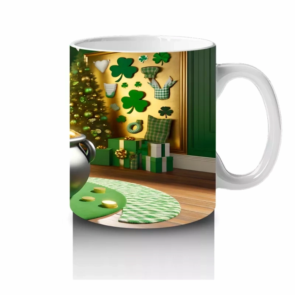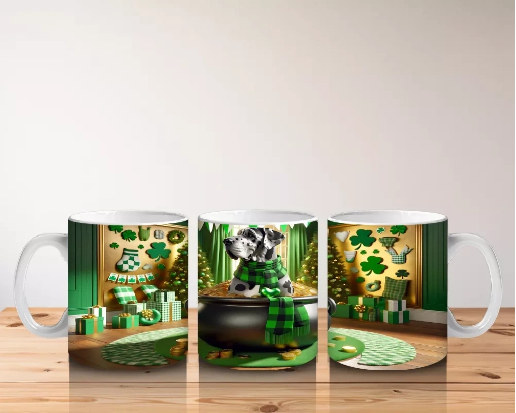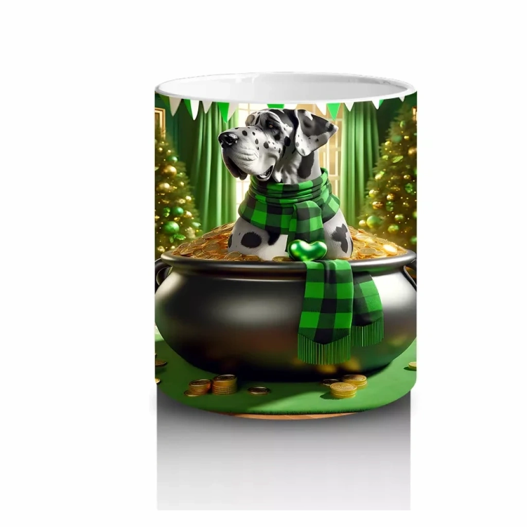 Şapkalı köpeğin yanında duran altın kazan, şans ve bereket sembollerini bir araya getiriyor. Neşeli ve parlak detayları sevenler için dikkat çekici ve enerjik bir tasarım.