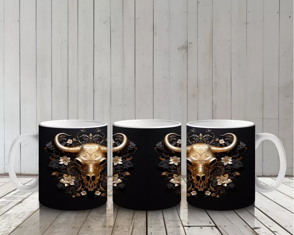 Siyah Zemin Üzerinde Altın Renkli Boğa İkilisi – Baskılı Kahve Kupası