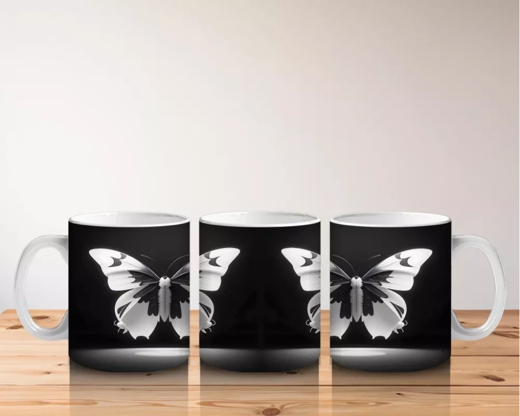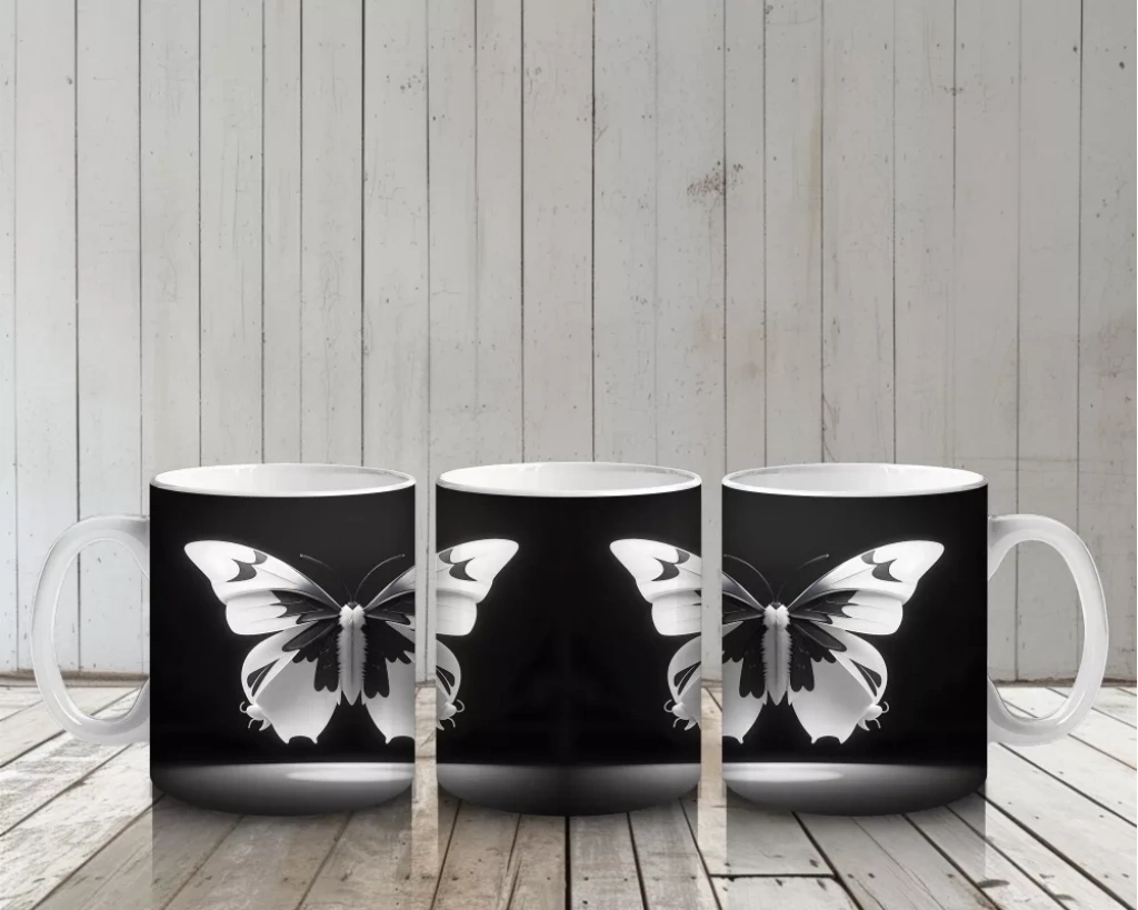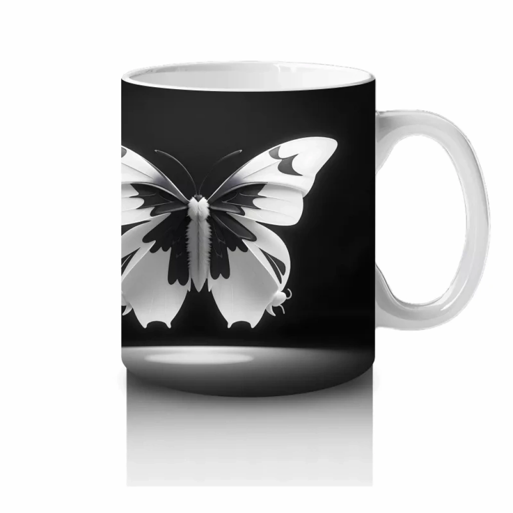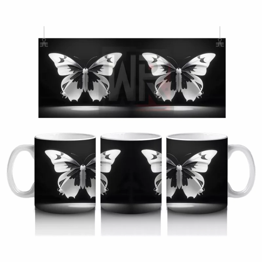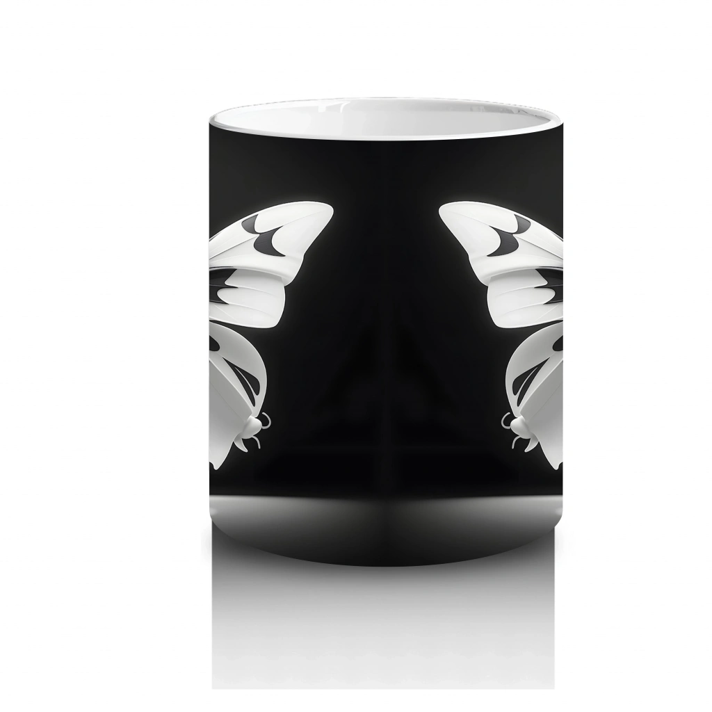 Siyah Zemin Üzerinde Beyaz Kelebekler – Baskılı Kupa
