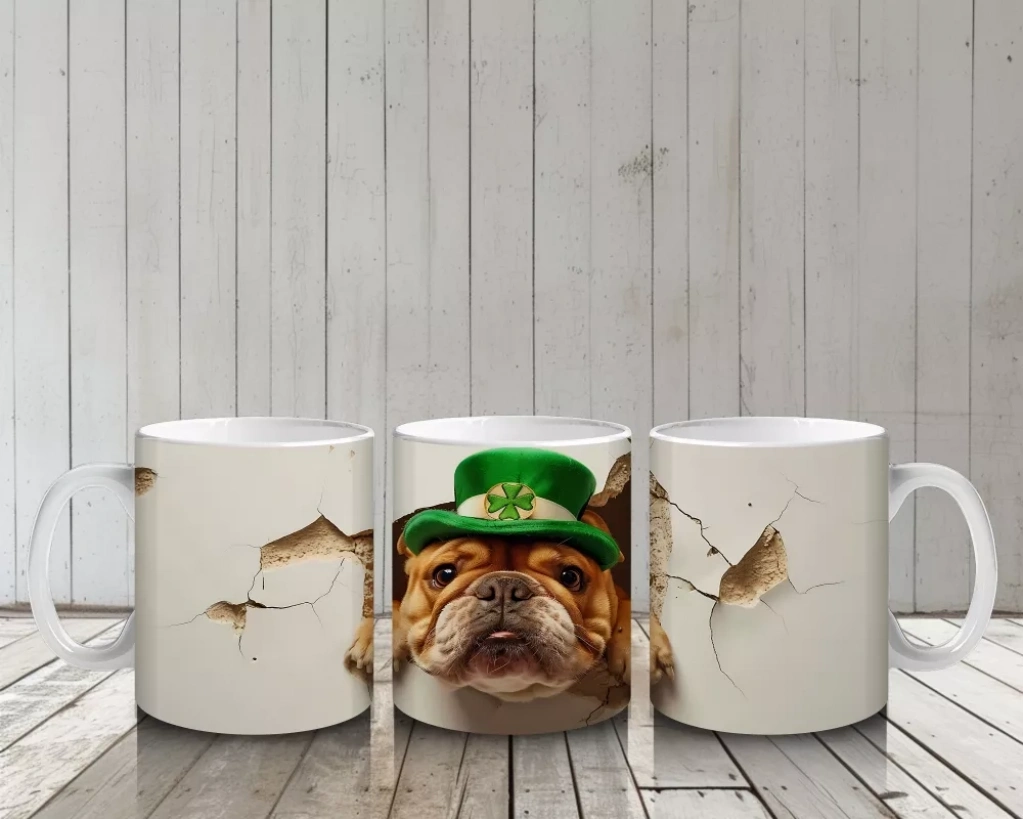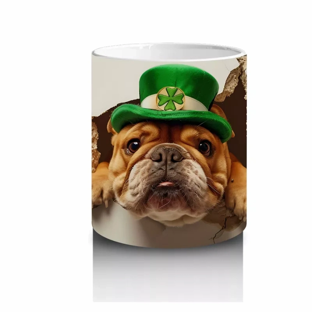 St. Patrick temalı şapka takan bulldog, kutlama ve eğlence havasını sıcak ve neşeli bir şekilde yansıtıyor. Tematik ve sevimli tasarımlar arayanlar için ideal.