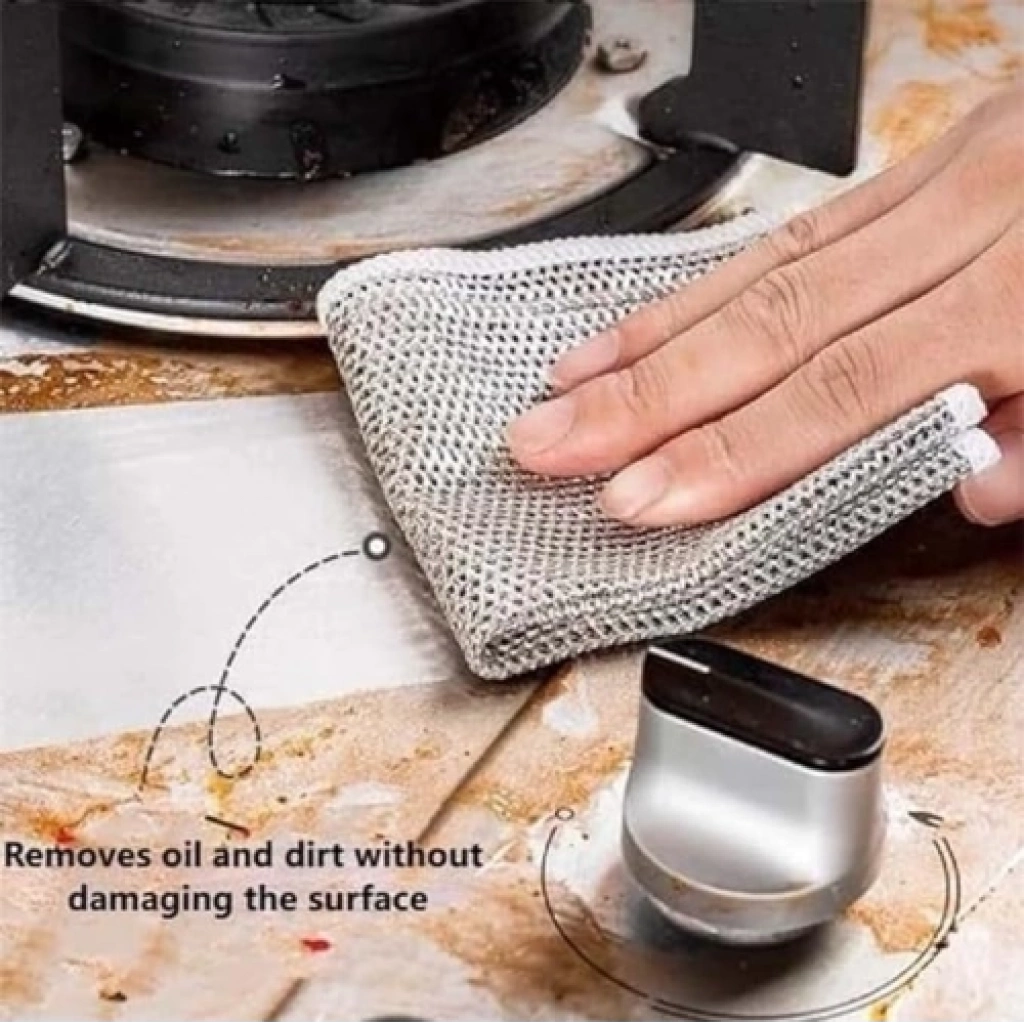 TENCERE TAVA OVMA BEZİ- Malzeme: Naylon- Renk: Alüminyum rengi- Boyut: 20 cm x 20 cm- Kullanım Alanları: Tencere, tava ve zorlu bulaşıkların temizliği için ideal- Özellikler: Çizik yapmaz, çok yönlü kullanım- Uygulama Alanları: Tezgahlar, gümüş eşyalar, fayanslar, yağlı ve kirli yüzeyler için uygundur.Bu tencere tava bulaşık bezi, naylon malzemesi ve özel tasarımıyla çizik yapmadan zorlu bulaşıkların temizliğine yardımcı olur. Alüminyum rengi görünümüyle şık bir görünüme sahiptir. 20 cm x 20 cm boyutlarıyla elinize rahatça oturur ve kullanımı kolaydır. Çeşitli yüzeylerde kullanılabilen bu bez, tezgahlar, gümüş eşyalar, fayanslar ve yağlı/kirli yüzeyler için idealdir.Paket İçeriği1 adet tencere tava ovma bezi