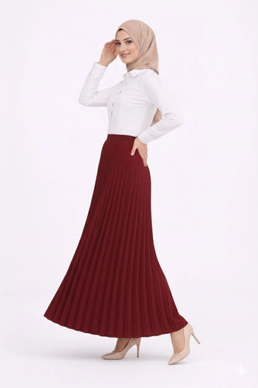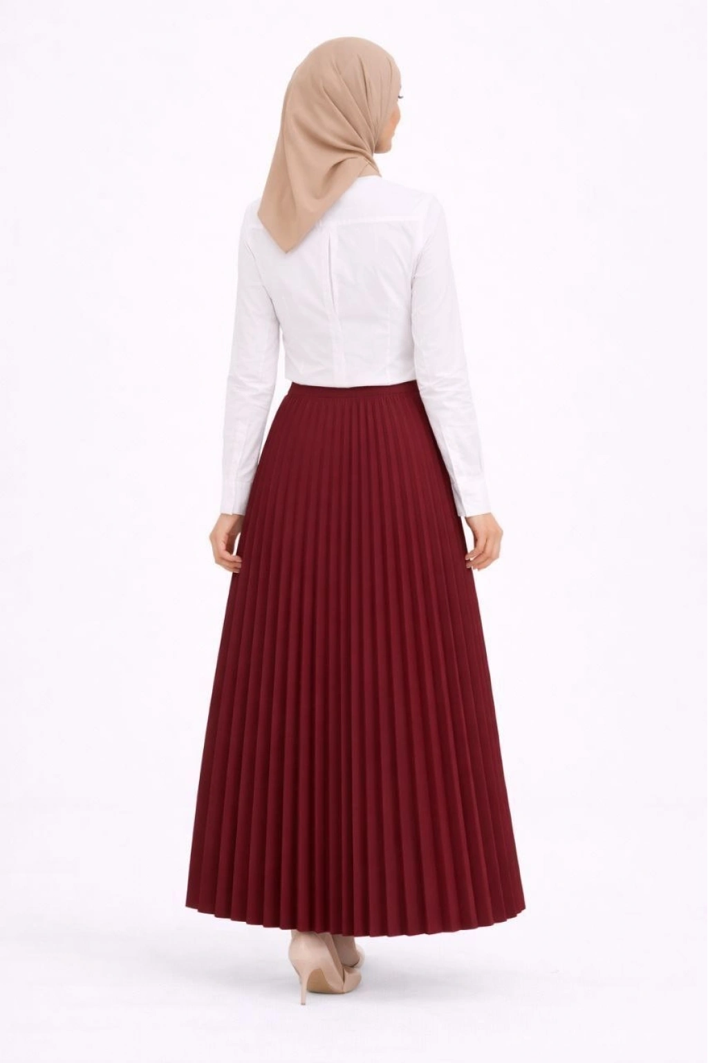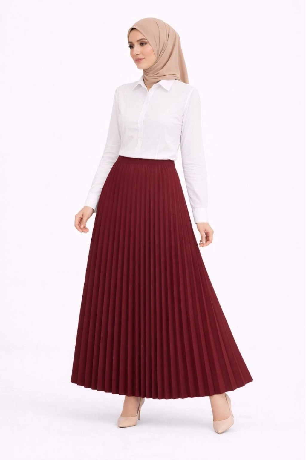 Tesettür Beyaz Gömlekli Pliseli Etek İkili Takım Gündelik ve Ofis Şıklığı - Bordo