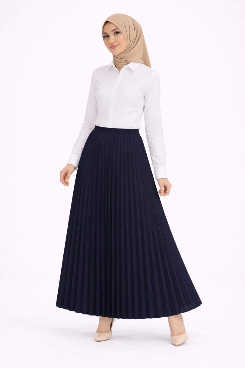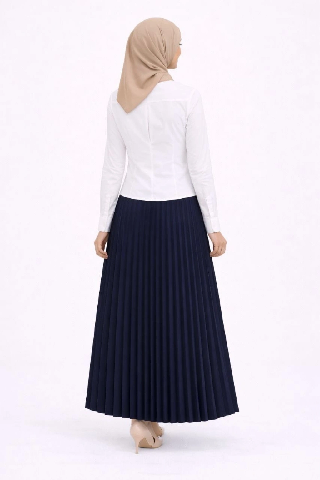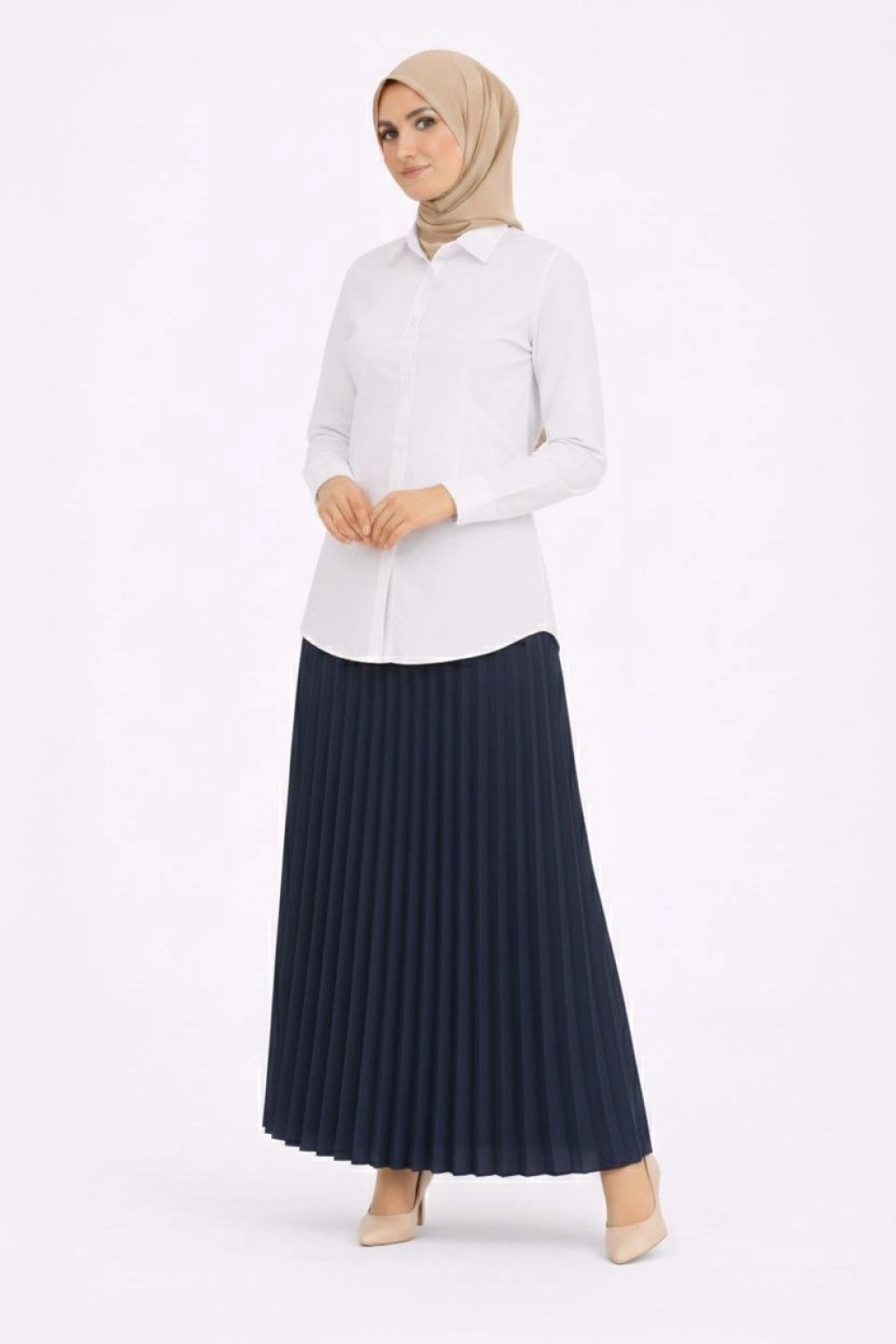 Tesettür Beyaz Gömlekli Pliseli Etek İkili Takım Gündelik ve Ofis Şıklığı - Lacivert