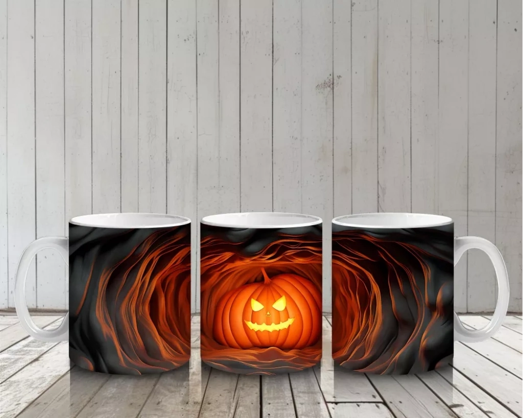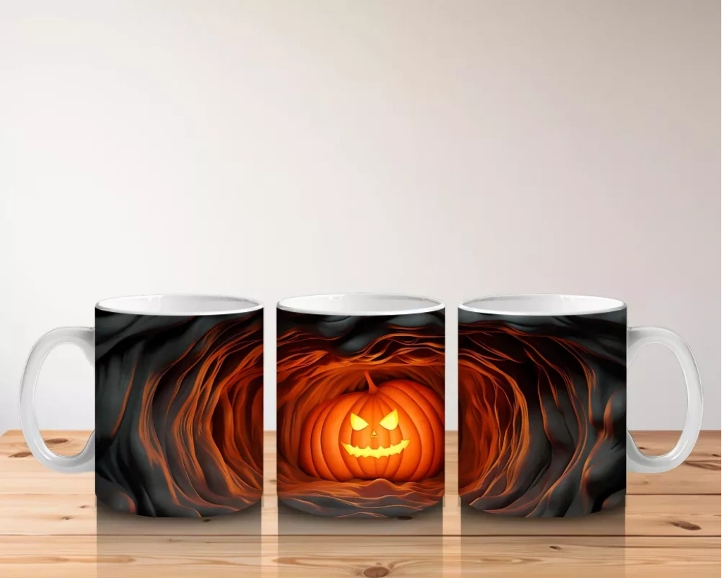 Yarılmış Duvarlar Arasında Parlayan Kabak – Hediyelik Kahve Kupası Işıltılı ifadesiyle karanlık duvarların arasında beliren bu balkabağı, Cadılar Bayramı gecelerine enerji katıyor. Şık ve eğlenceli bir baskılı kupa modeli olarak hediyelik kahve kupası kategorisinde öne çıkar.