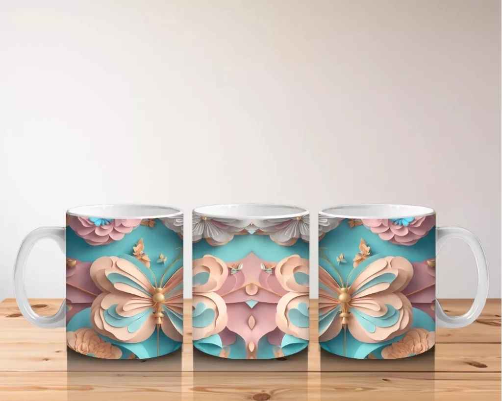 Turkuaz tonlarında, kusursuz simetriyle yerleştirilmiş kelebekler, görsel bir denge ve ferahlık hissi sunuyor. Modern ve dikkat çekici detayları sevenler için estetik bir kupa tasarımı.