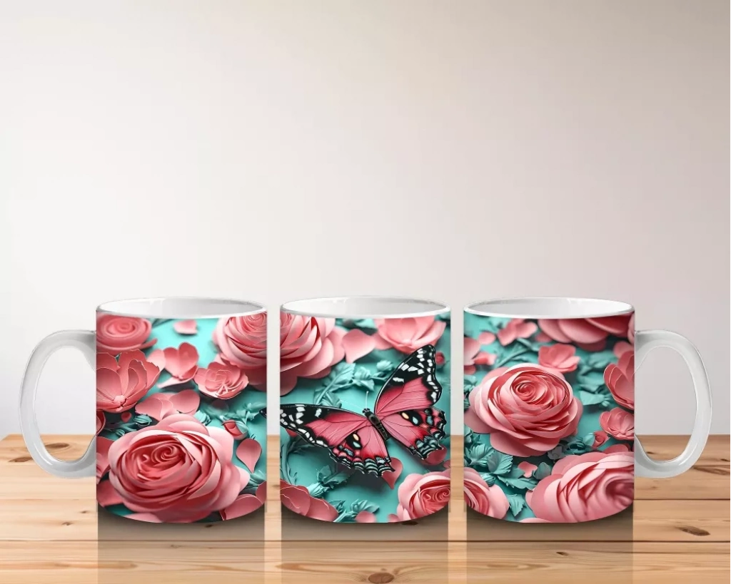 Turkuaz Zemin Üzerinde Pembe Kelebek – Baskılı Kahve Kupası