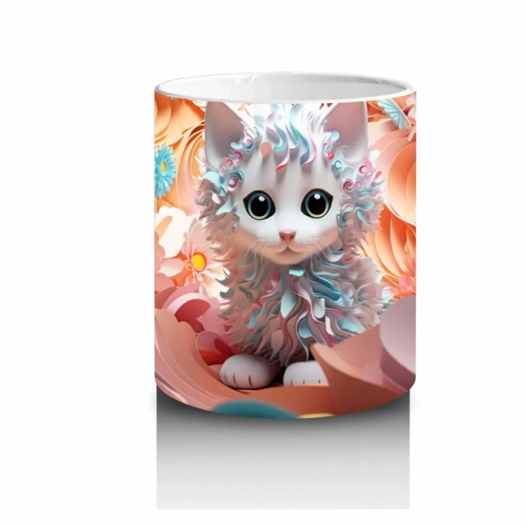Turuncu çiçeklerle çevrelenmiş, parlak gözlere sahip kedi figürü, canlılık ve enerji dolu bir görünüm sunuyor. Renkli ve pozitif detayları sevenler için göz alıcı bir kupa tasarımı.