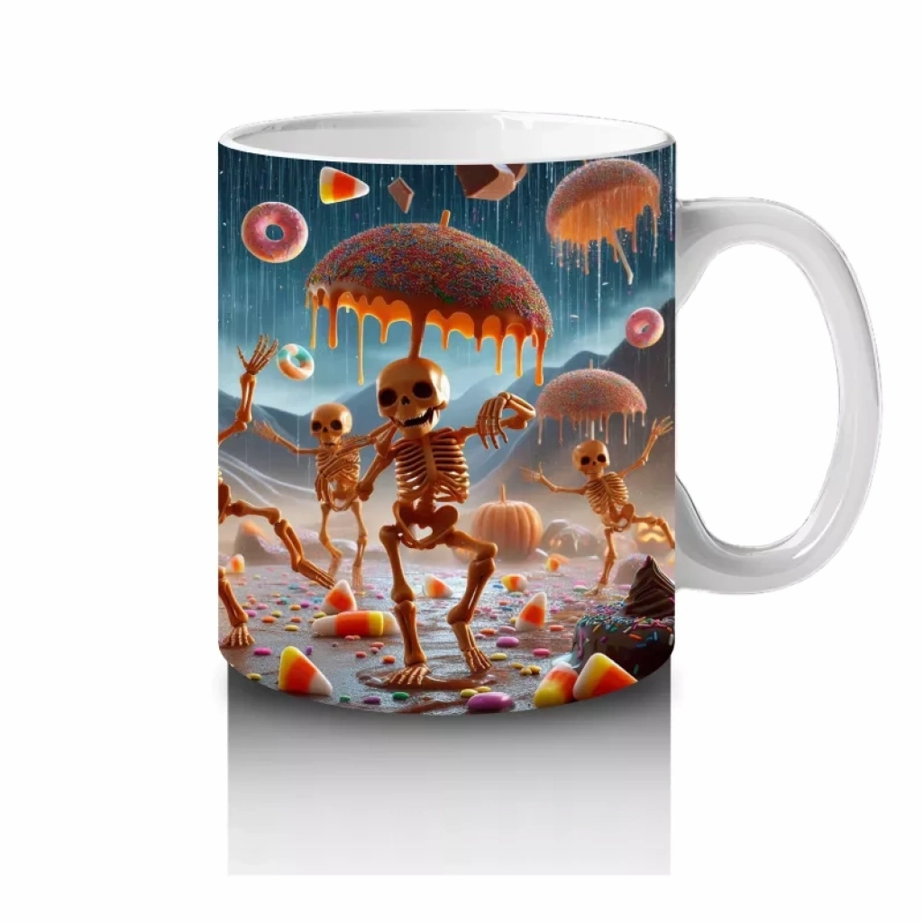 Uçan balkabakları ve şekerlerle tasarlanan bu renkli kupa bardak, Cadılar Bayramı’na neşeli ve canlı bir hava katar.