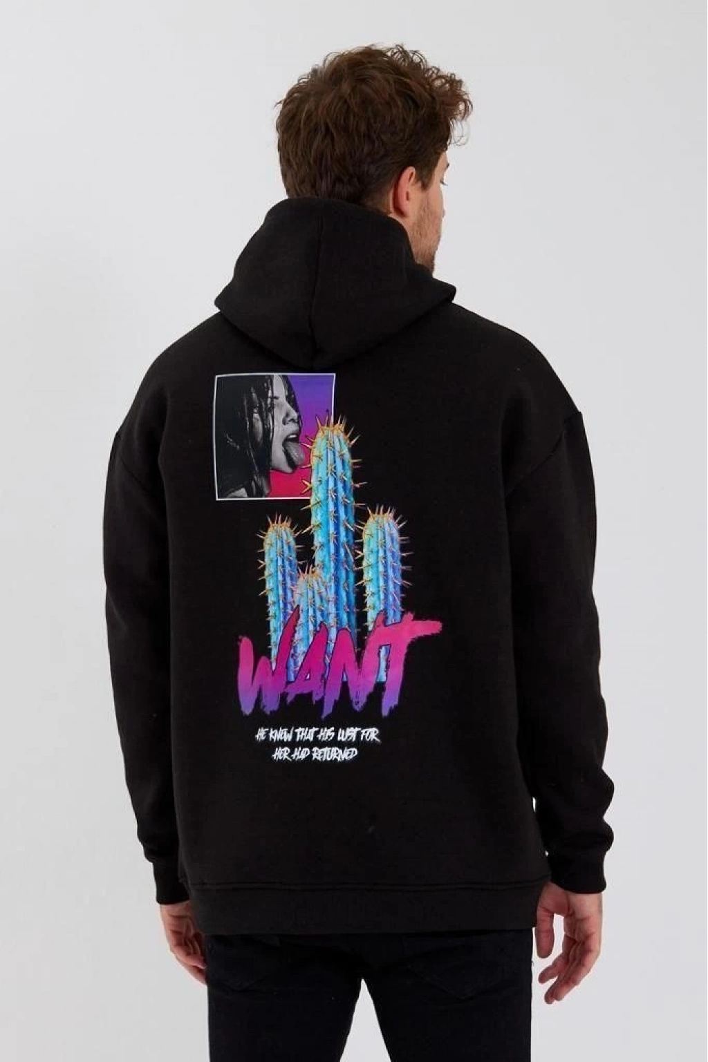 Baskılı Üç İplik Kapüşonlu Oversize Sweatshirt - Siyah -