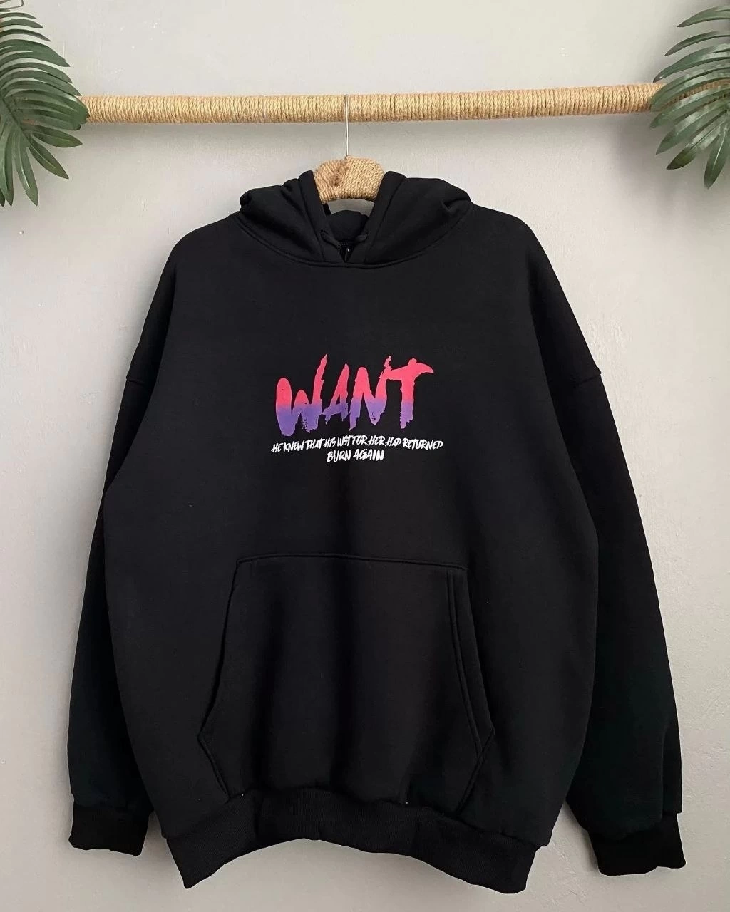 Baskılı Üç İplik Kapüşonlu Oversize Sweatshirt - Siyah -
