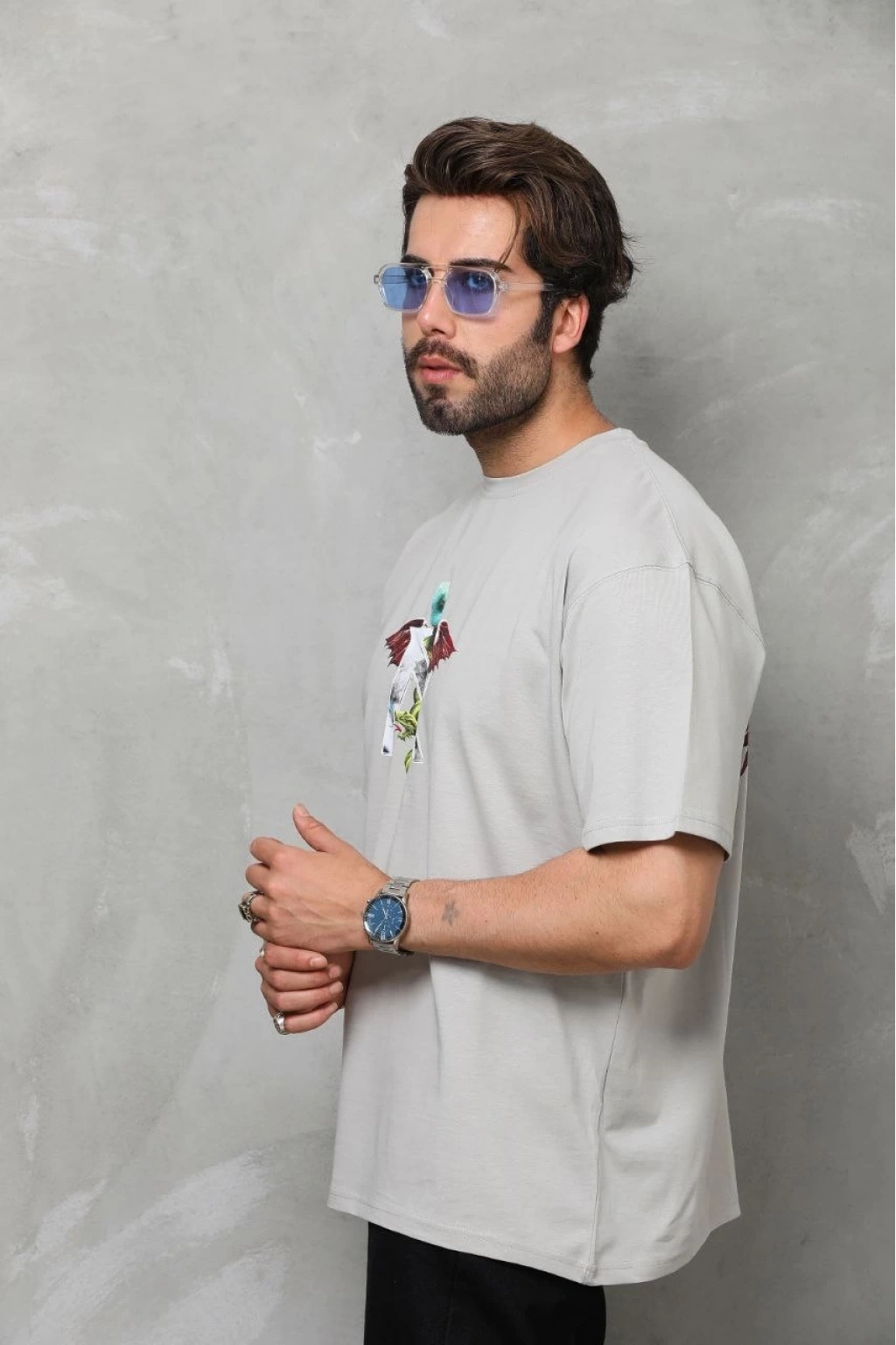 Bisiklet Yaka Baskılı Oversize T-Shirt - Gri -