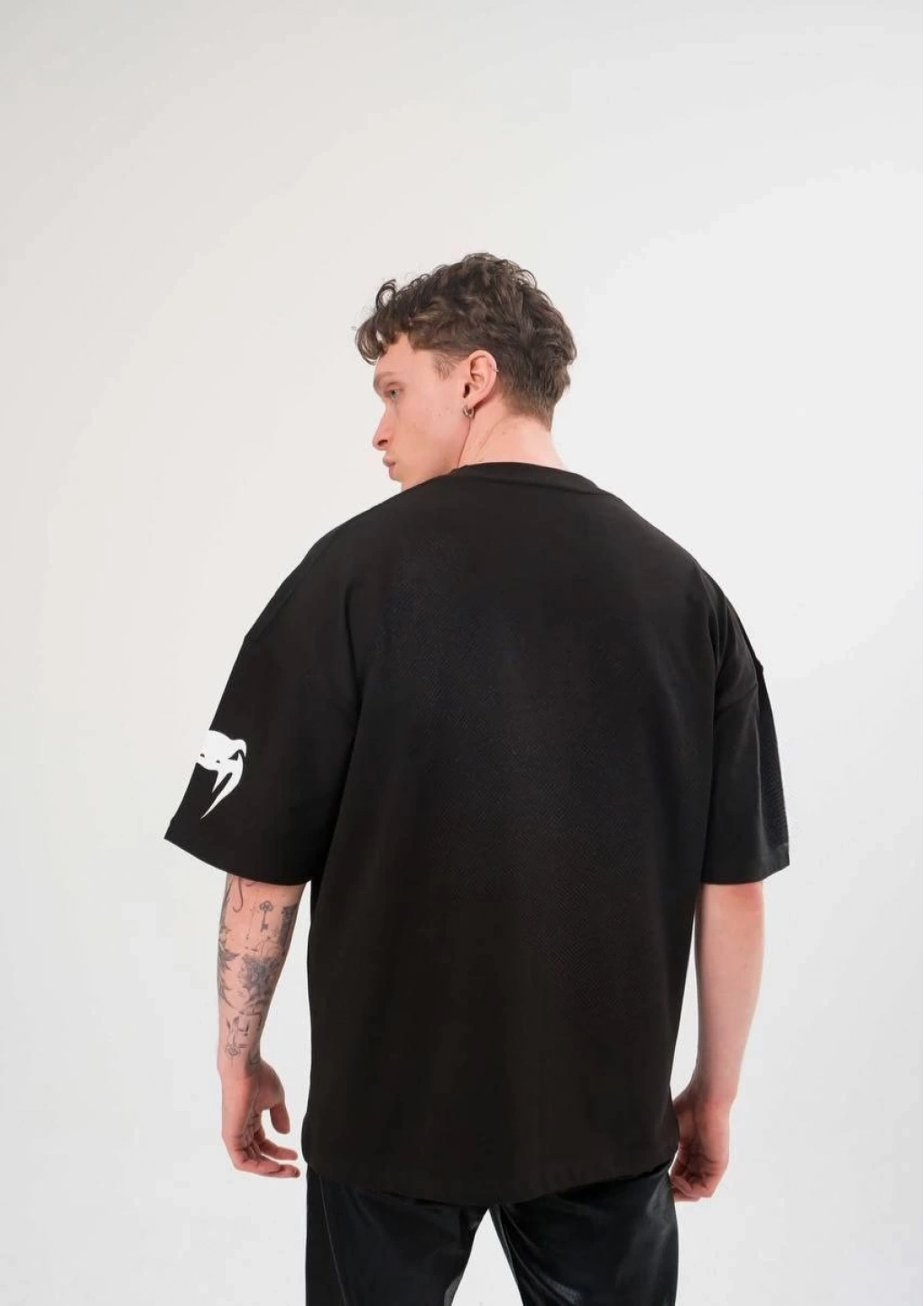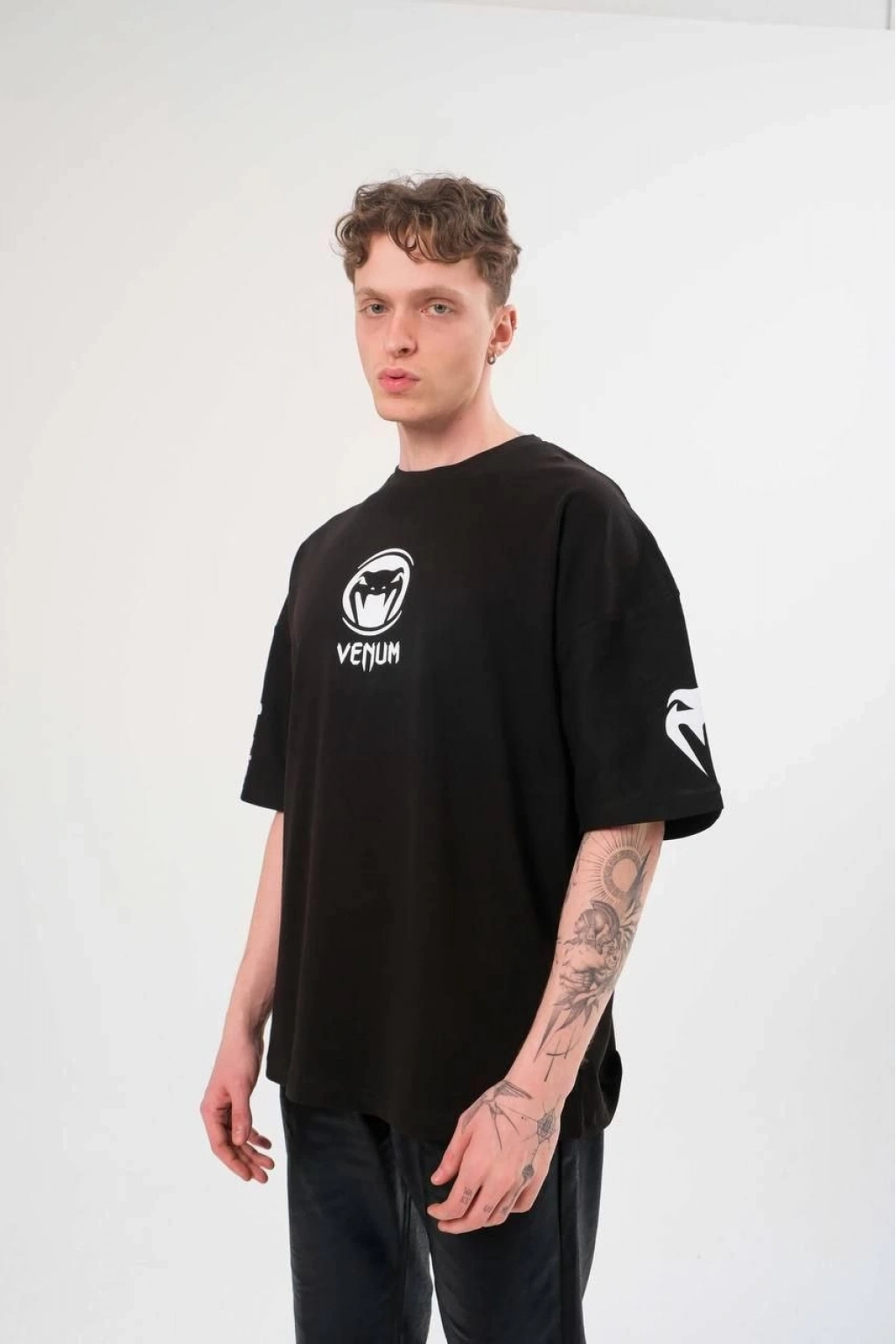 Bisiklet Yaka Baskılı Oversize T-Shirt - Siyah -