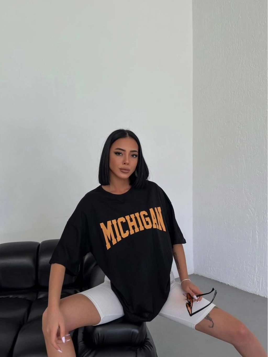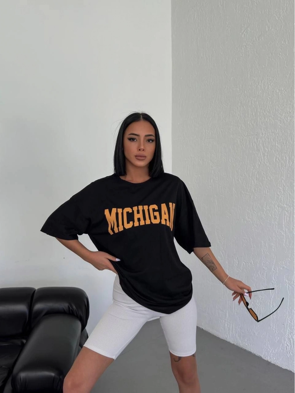 Bisiklet Yaka Baskılı Oversize T-Shirt - Siyah -