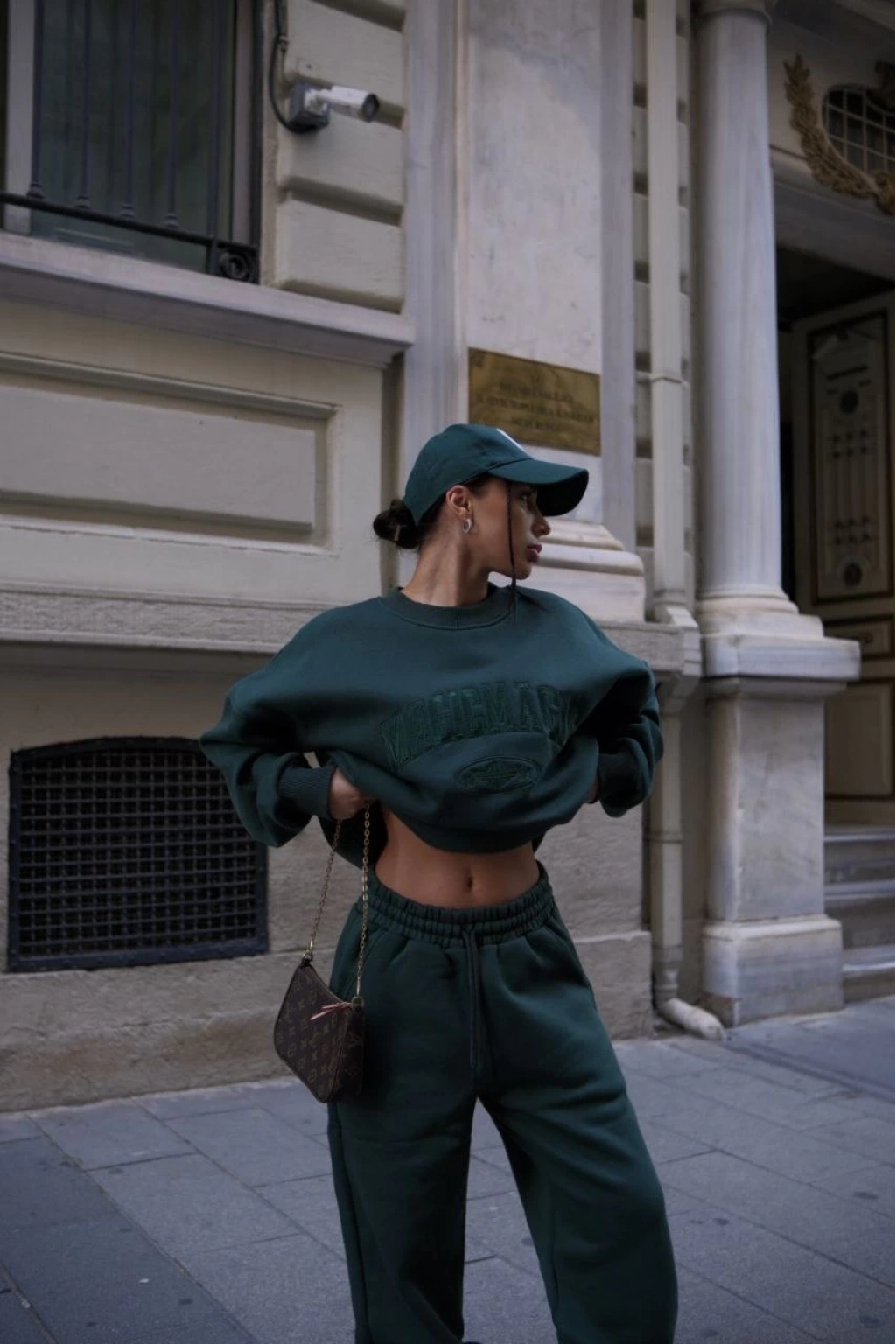 Bisiklet Yaka Nakış İşlemeli Üç İplik Sweat Takım - Yeşil -