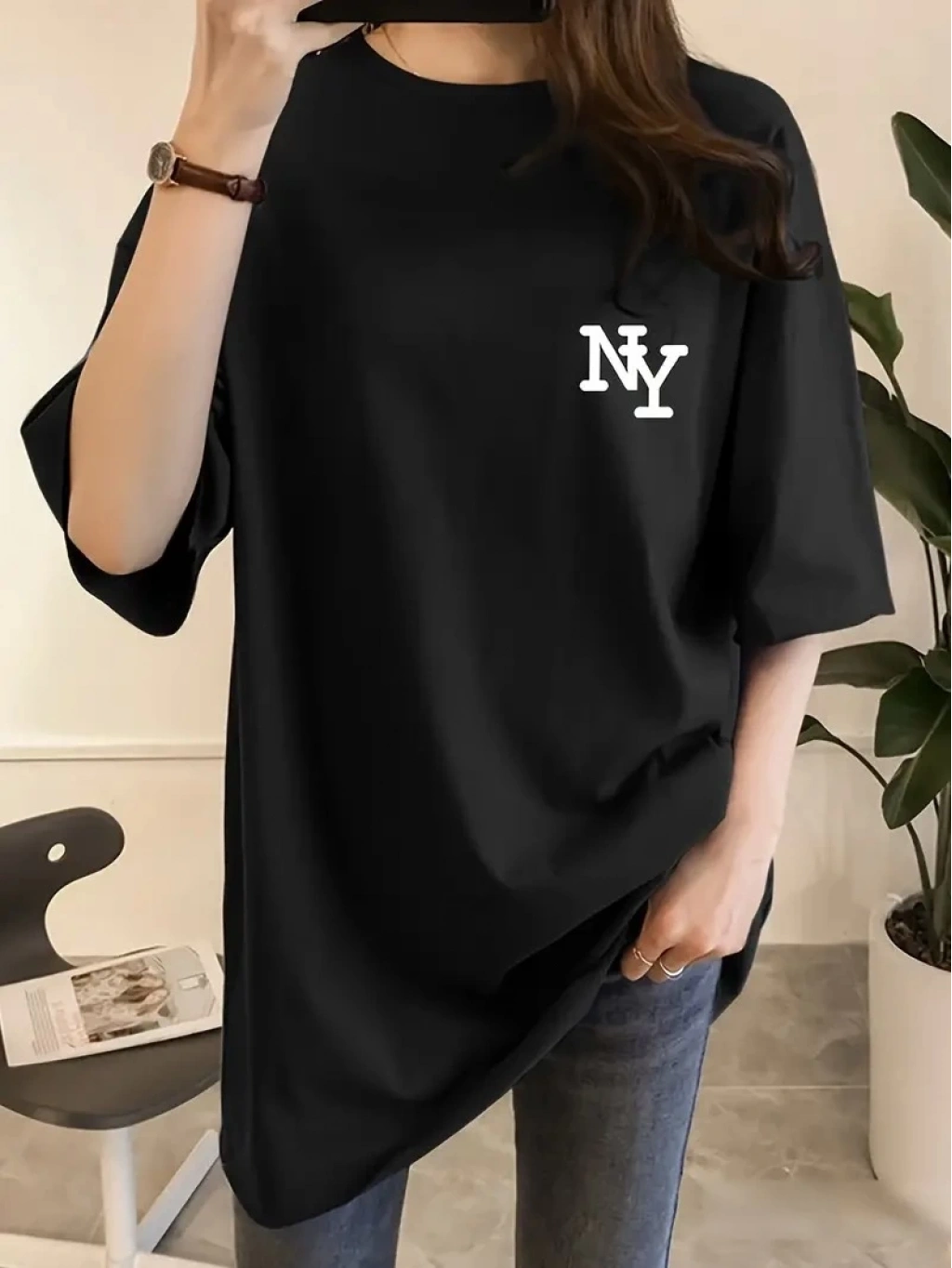 Eğlenceli Harf NY Baskılı Bisiklet Yaka Tişört - Siyah -