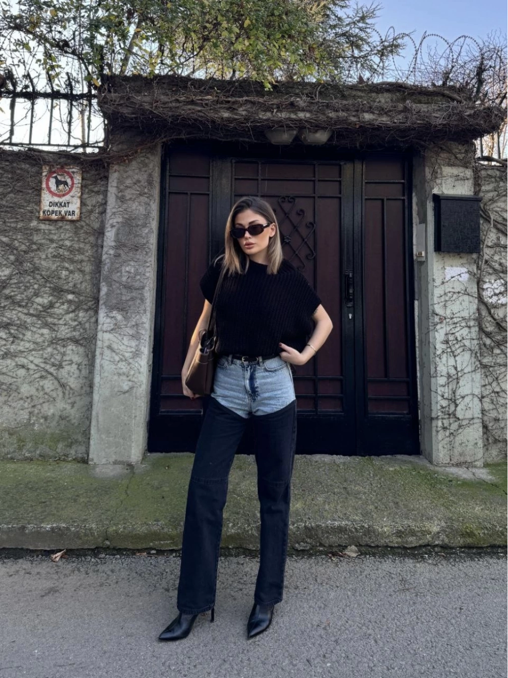 Jeans Kot Parçalı Palazzo Pantolon - Siyah -